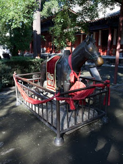 At first this one seemed to be yet another temple but this one had something I’d not seen before. Forming the outer walls were dozens of little alcoves arrayed along long porticos, each representing the pantheon of Taoist deities. These little groupings are called “departments” and they cover the full spectrum of Taoist life in the spiritual world. Rivers, Forests, Truth, Heaven, Punishment, Records, Wisdom, Lies, Theft, Life and Death – each room had ten or so life-sized painted plaster carvings of the various players on their vast cosmic stage. Fishmen, Frogmen, Demons, Sages, Buddhas and Farmers – all present and accounted for in a half circle to each side of the celestial department manager. Taoist has 76 of these departments and there was a room for each, holding nearly 1000 statues. Out of respect I usually don’t take pictures in these places but I snuck a few on this occasion when no one was around. In the most remote courtyard I found artists selling their rendition of the Jade Rabbit, that floppy eared fellow who lives in the moon making medicines for the gods. He is popular here as he is known to put an end to plagues. I fell into a conversation with one of the vendors, admiring his work and talking about the spotted animal that the Jade Rabbit was riding. I thought Appaloosa and so I picked out two to purchase. Upon closer review they turned out to have antler and so were not horses but deer but it didn’t matter, they were a nice trinket in spite of being the wrong mount. Dongyue also had a fine collection of stone stele, perhaps 1000 in total. The columns, recording the most mundane of life’s details – births, deaths, tax collections, visits by dignitaries and holy men – are a common feature at cultural sites across China. In this case they were arrayed in little squares beneath towering pines and offered a nice opportunity for a reflective walk.