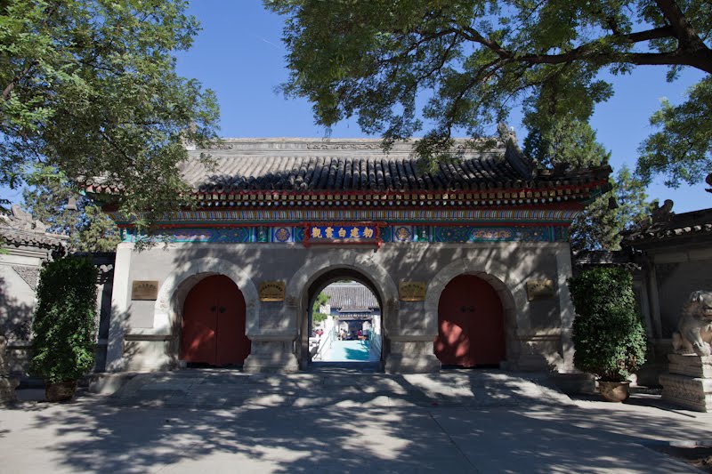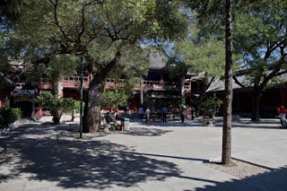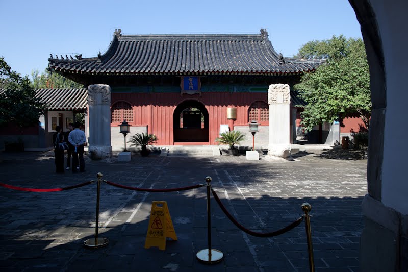 I left the mall and started walking roughly in the direction of my next destination, Dongyue Temple. Instead of walking the main streets I took a turn and wandered into Lumincang Hutong, one of the old neighborhoods that ring the former Imperial capital. These charming little ghettos used to house the people that worked in the Forbidden City and today they house regular people. Their condition got me thinking about a piece I had read the day before in the New York Times. Thomas Friedman was writing about his trip to the World Economic Summit and he was musing about the 200 mph bullet train that he was riding from Beijing to Tianjin. He said that they built it in only 9 months and he was wondering why America can’t do the same thing. I thought these hutongs said quite a bit about this. Tiled concrete blockhouse communal latrines every 10 yards and water taps at the intersection of the crooked little lanes, all within a half-mile of the center of the Chinese government made me think perhaps that the Chinese might be a tad more interested in providing impressive engineering projects for the consumption of naïve western journalists than in giving the most basic services in the literal shadow of the center of power. Built by men living in communal prefab dormitories governed by few safety regulations, things can indeed go up very fast over here. I didn’t arrive at an answer as to why westerners can’t see the forest for the trees when it comes to China, but I did have a nice time taking in the sights along the shady lanes. One thing I have taken away from my time here is that so much can be gained by just spending you time among regular people doing everyday things. Eventually I literally stumbled on Zhihua Temple, one that had eluded me on a previous visit to this district. It wasn’t a surprise that I had missed it before – it was one of those places that you can only find when you’re not looking for it as it was tucked into a niche at the end of a tiny lane.