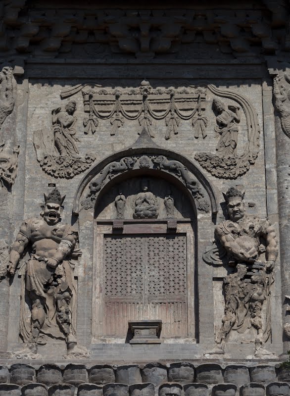 I could tell immediately that this place was special. The compound was pretty much deserted aside from some construction workers busy on a renovation project and a handful of worshipers doing the same clockwise circumambulation of the shrine that once finds at the Jokhang Temple in Tibet although minus the prayer wheels and the beads. At the center of a courtyard formed by low crimson buildings with gray stone tile roofs stands a 189 ft. tall eight sided stone pagoda carved with the pantheon of Buddhism. These pagodas were built to house the scriptures and relics brought to China more than 10 centuries ago by itinerant monks who traveled the trade routes between here and India and as a result you see motifs that reflect not only the emergence of Buddhism here, but also those associated with the place of its roots. Indian Elephants carry Guanyin and Bodhisattvas across doorways guarded by the same fierce temple guardians you see in Lhasa. Persian fairies float in the air and Chinese saints stand guard above the bricked off windows. Everything stands supported by a base of overturned Lotus leaves, carved in the same gray stone and representing eternity. At the lower levels the carvings lack heads, knocked off by zealots during the Cultural Revolution but above, they’re intact, swirling above the now much changed urban landscape.