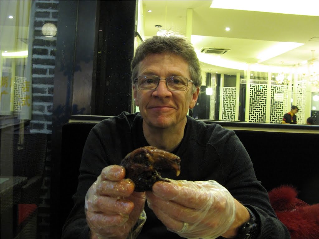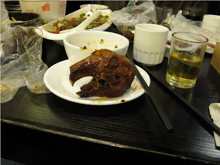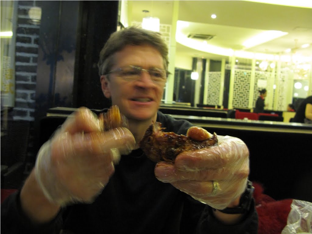 The first thing I noticed was the amount of trees. I’ve never seen so many in China outside of the French Concession in Shanghai. Big Plane Trees, still bearing a full crown of leaves lined every road we drove. China is urban and modern but throw in a canopy of leaves and you’re taken back 100 years to when these cities were still clad in their Chinese history. I sat back and watched the shadows playing on the moon roof. They took me to what would be best described as a “food court”, a three storey alley lined with small restaurants and bars. We parked and walked in and were immediately harassed by a little girl, perhaps 6 or 7 trying to sell us a rose. She wouldn’t take no for an answer, at one point actually sticking one in Ben’s back pocket. Retail starts early here as it takes time to develop the fully obnoxious behavior necessary it takes to be successful selling things that no one wants. A young man in a shiny silver suit sidled up and asked us into his place; we walked on rounding a corner and entering the last place on the block. Brightly lit, seemingly clean and about half full of late night diners. Ben and I sat down and ordered, the girls stood up to leave but not before Sahsa asked me what flavor rabbit head I wanted. Ben and I had been joking about those the day before so I took that as a humorous question. I told her “very hot” and they left. A couple of courses came out – dumplings, fish, a couple of other things or two. We had a long discussion about beer, insisting on cold ones and they brought us a couple of bottles. Beer is almost always served warm in China and often it’s the only choice. The food was great – hot and tasty, the two hallmarks of “Chuancai” as it’s known here. I was just about stuffed when they returned with another meal in take out bags – it’s not a problem here to sit in a restaurant, order some things and then supplement the meal with food from some other place. Sahsa handed me a pair of plastic gloves and one of those bags that we use for fruit in our supermarkets. It contained a dark brown globe swimming in sauce – I was about to further extend my culinary boundaries, I was about to eat a rabbit head.