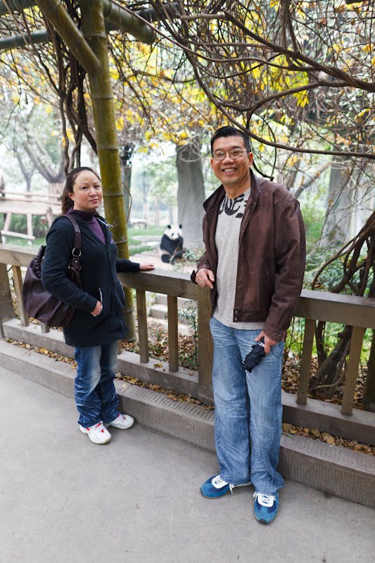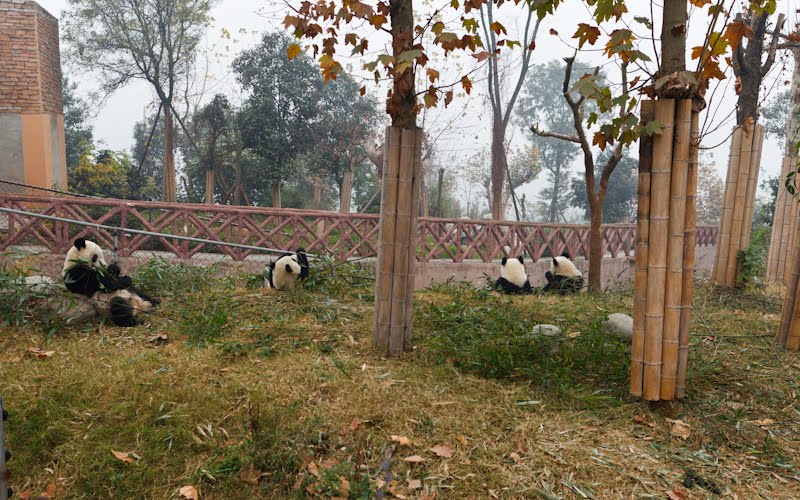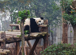 Once inside, my worry that the place would turn out to be a dump was washed away – the grounds were beautiful. Pin neat paved paths led off from a main street into damp bamboo forests, a simulation of how these wonderful animals live in their natural habitat. The weather was cooperating in the artifice too – a faint mist had descended on us. For a moment you could almost believe you were high up in the forested foothills of the Himalayas. After a review of a decent display map we chose to head off in the direction of the juveniles and we hit the jackpot at the first enclosure we came to – a pair of big brutes passed out on a log platform while one of their pals was spread out on its back below, gorging on bamboo shoots. In a place like this you take a lot of photos of the first animals you see because you have no idea how many you’ll find down the road. As I stood there taking shot after shot a young woman tapped me on the arm and said, “excuse me” and asked,” aren’t you the person who sat across from us at the mushroom hot pot restaurant last night?” I turned around and sure enough it was the family we’d been discussing over dinner (see last blog, western woman, Chinese man and two daughters.) I laughed and said “yes” and she replied “I guess you love the Pandas as much as we do.” I agreed and they walked away smiling.