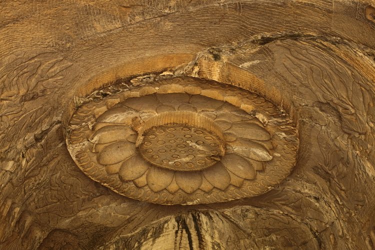 After walking past the entrance and retracing our steps across a field of newly laid sod, we bought our tickets and began the tour. Places like this can impart a wonderful sense of peace and spirituality. That feeling here was a bit disturbed by the loud acoustic guitar music playing from speakers along the path. It was a 30 second tape loop which I recognized as the same music that Air China plays during the mandatory safety briefing before each flight. I was worried that it would be stuck in my head forever, but the challenge of climbing all the steps up to see the art put it out of my mind. The grottoes extend about ½ mile south along the west bank of the Yi River. You walk along this set, cross a bridge and then continue back north along the east side. We climbed and photographed and visited with a nice Aussie couple who were spending 3 weeks backpacking across the country. Despite the vandalism, the statues were wonderful, including a very special lotus flower carving on the roof of one cave and another that featured more than 10,000 four-inch square Buddhas. I’m always amazed at the fact that carvings like these were done in relief, starting at a rock face, continuing into a niche and resulting in a Buddha that stands out from the wall. Up above we could see the original edge of the rock wall.