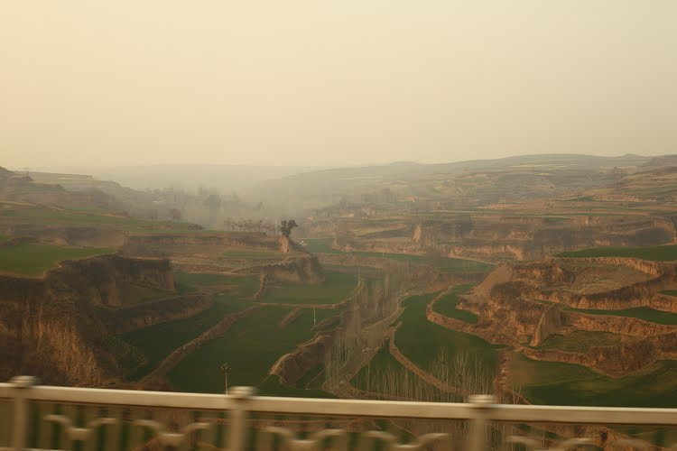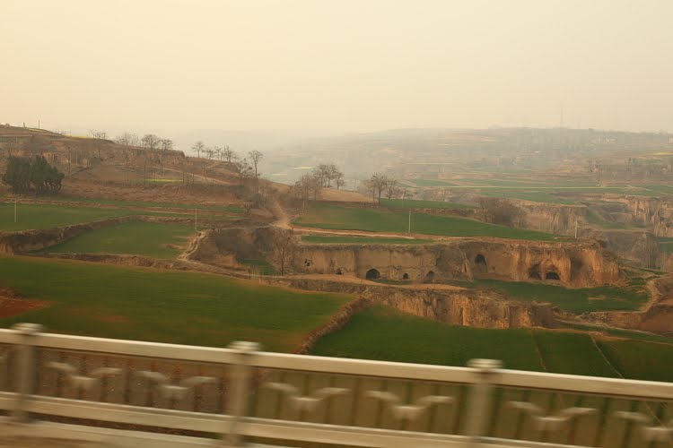 Shaanxi province sits atop the loess plateau region of China. Built by eons of windblown silt from the Yellow River, the land is very fertile if irrigated and highly eroded due to the soft nature of the rock formed by the dirt. Local people have used this property of the land to build terraces and cave houses for a millennia. Less popular today than in the past, you can still see ornate brick facades forming the entrances to homes that are completely underground in the tiny villages along the train’s path. Hundreds of older abandoned caves also dot the hills along the route, interspersed with the bright yellow flowers of some spring crop. I’d seen those plants last April in Yunnan but never did figure out what they were. Here they grew in bright green patches on irrigated paddies on the side of just about every eroded gully we passed.