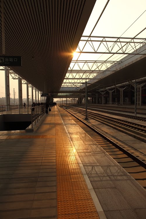 The new train station lies north of the city and while open for business it remains in a state of construction. Our driver had to perform a couple of u-turns in order to figure out how to get up to the entrance. Once inside I was struck by two things – it was a huge cavern of gray marble and it was freezing. Far colder inside than out, as though all that polished stone was sucking what little heat the morning air held. We shopped for chocolate and Oreos and wandered around giving the place the once over. Very trim and efficient, with McDonalds, KFC and a handful of noodle shops under construction on the second floor. There were three little grocery shops on the first level selling local treats along with cheap bai jiu (Chinese tequila) and beer. It made me think that the second and third class cars might offer some interesting companionship. We heard the announcement and went to our gate and queued up only to discover that because we’d purchased our tickets at the old station, we’d be unable to use the automated readers. An attendant opened up a separate gate and punched ours. We took an escalator down to the platform.