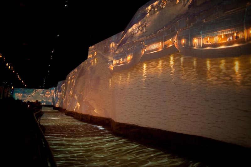 Our forward progress was finally stopped once inside as people were funneled into a queue for an elevator ride. Apparently you start at the top and work your way down. Even this inconvenience was slight – no more than 10 minutes – and following being crammed into the car and a quick ascent we were let out in front of a theatre. I wasn’t really interested in seeing whatever it was they were offering so we skirted the crowd and entered a hall called The River of Wisdom. It was the best decision we’d made in a long time. This floor was dedicated to the history of China and featured a 300 by 30 foot animated rendition of a famous 12th century Song Dynasty scroll called ”A Riverside Scene at Qingming Festival” by the famous artist, Chang Tse-duan. This modern version was done by the same artist who played a significant role in the opening ceremonies of the 2008 Beijing Olympics, and it was wondrous.