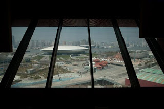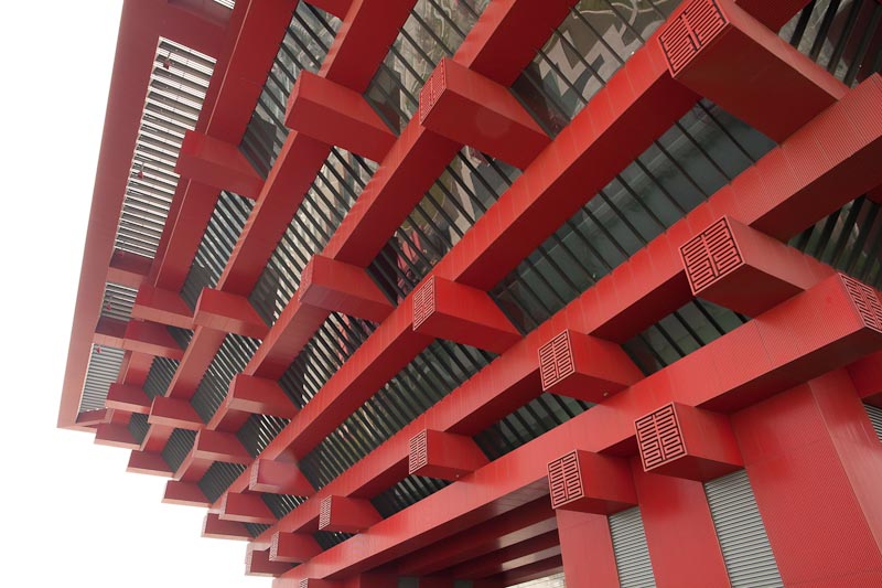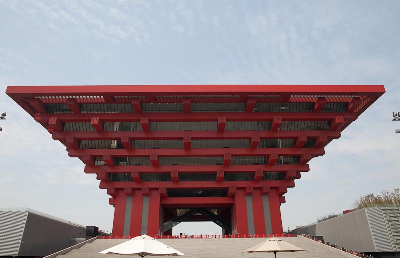 Our first few days had been heavily loaded with travel and attractions. To counteract the sense of exhaustion, we decided to keep our first day here leisurely and simple. The China pavilion was the last attraction still open at Expo so after a slow breakfast we left the hotel around 11 and caught a taxi across town. The streets were not busy and we made it there in no time. Now I had a plan to wander around the grounds, I had no desire to wait in what had been reported on-line to be a 1.5 hour queue. All I wanted to do was take some photos of the other pavilions and have a stroll. It wasn’t clear how to do that upon arrival so we simply fell in behind a small group who happened to be walking past the lines to buy entry tickets. They were waved through the security checkpoint, we were not. The guard asked for a ticket, I told him that we just wanted to walk around and had no intention of visiting the pavilion. He told me to turn around, go back a block, take a right and walk some more. I didn’t like the sound of any of that and in any event was in no mood for that amount of walking so we thanked him and turned back to where we had been dropped off. There didn’t seem to be a clear solution to do what I wanted to do so after a brief conversation we decided to bite the bullet and brave the China pavilion on the off chance that it might offer a way in. As we threaded our way through the mostly empty serpentine crowd control barriers, scalpers offered to sell us entry passes. I waved them off, knowing full well that their wares were almost certainly frauds. I made the purchase and we headed towards the entrance having no idea whether we were in for a quick tour or an endless wait. Judging from the hundreds of identically dressed school students on class tours the latter seemed likely but we kept moving and in only the time it took to walk from the ticket booths to the building entrance, we were inside. Along the way we provided entertainment for the school children answering what seemed like an endless series of “Hello” and “Where are you from?”
