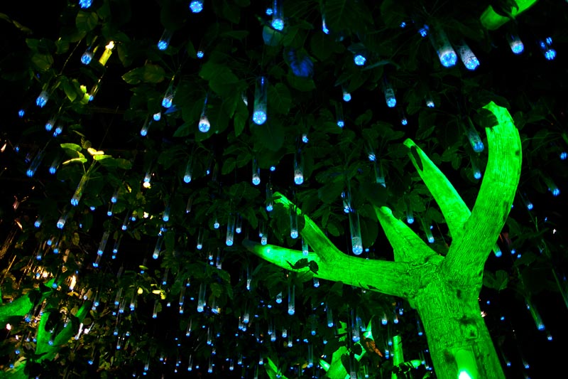 At the back of the gallery, a people-mover carried visitors through a hall called “China’s National Treasures” which turned out to be a 15 second ride past the bronze chariot that normally resides at the Terracotta Warriors Museum in Xi’an. We’d seen the stand-in version three days prior, so that loop was now closed. We exited the ride and headed downstairs through a hallway of lofty green lit trees that opened up to another gallery lined with tall glass rods that changed from crystal clear to blue to green. An artistic representation of rice fields. The floor below was dedicated to green energy and not all that interesting. At least not following the River of Wisdom. It occurred to me that nothing else in the place could possibly compare. You could see the Expo grounds out the windows and from this vantage it was clear that the place was no longer open. My plan to wander around was dashed, but it didn’t matter because the visit to this pavilion had turned out so well. We caught the exit escalator down through a huge circular hole in the bottom of the building, lined with pink water lilies. Water cannons shot intermittent streams into the air, forming a wall of ever changing designs. At the bottom we bought a Coke and sat down for a brief rest. Within 2 minutes of being there a middle-aged woman came over and gave me that famous look. I invited her to sit between us and her husband took our picture. While the staring a gawking was certainly less here, the desire for a photo of the westerners never seems to wane.