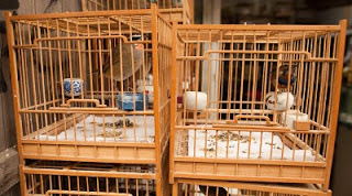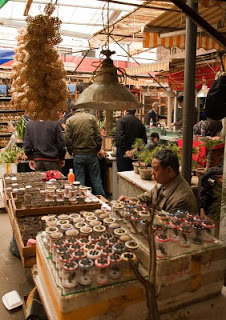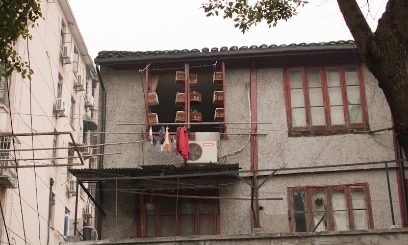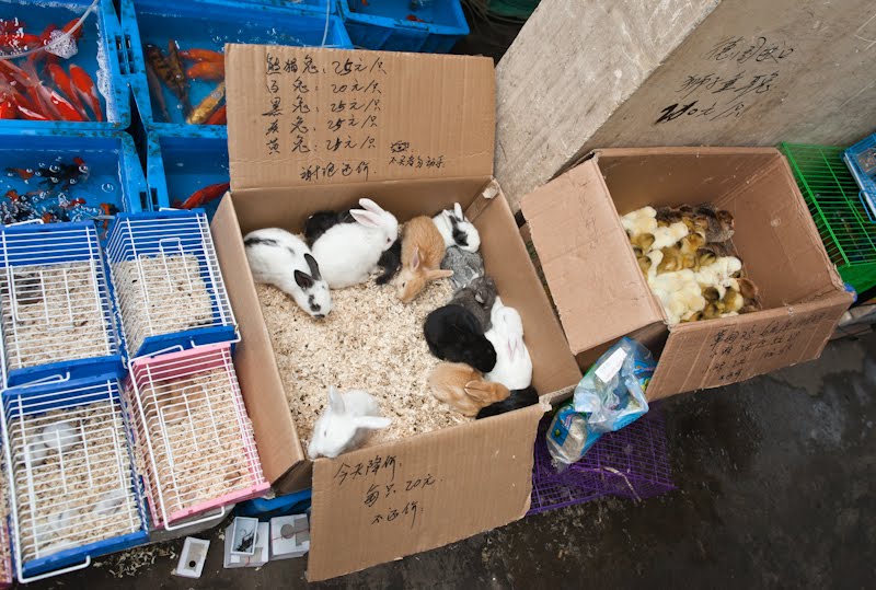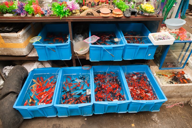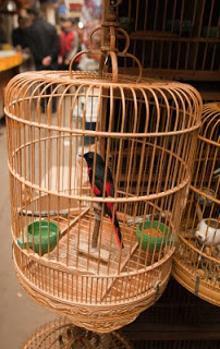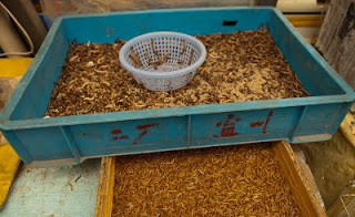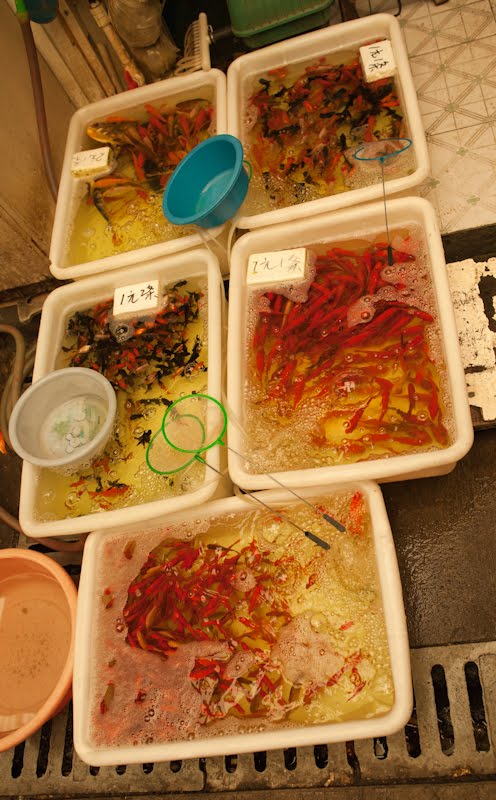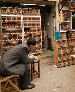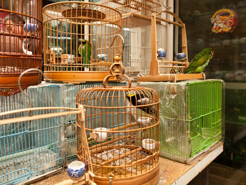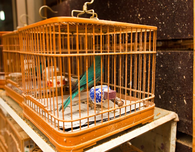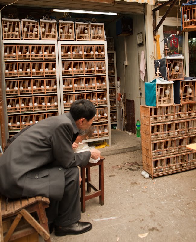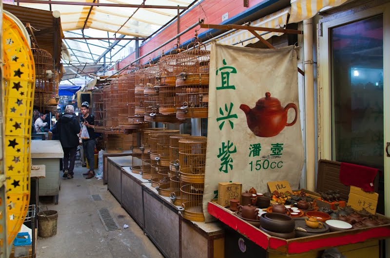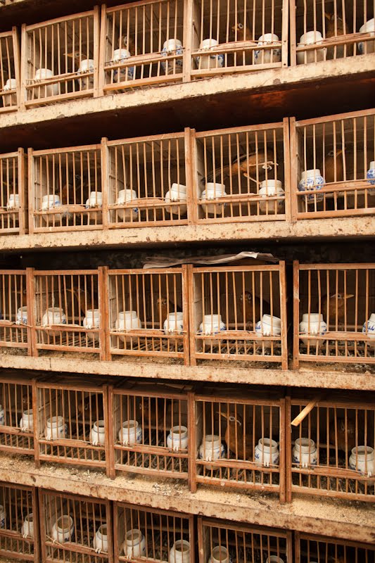 I had a single destination in mind today, the Bird, Fish and Insect Market. Leaving the last neighborhoods of the old city behind, we made our way to Tibet Road and found the entrance. I’d stumbled upon this place on one of my wanderings many years ago and while it represents the worst of man’s inhumanity towards our animal friends, I just can’t resist visiting. It is such an anachronism in this modern city, probably the only place where a smidgen of traditional China remains among the gleaming skyscrapers and fancy villas. A fancy new façade had been added to the old structure, suggesting to me that my worries of its demise were unfounded. We walked in a spent a good hour looking at all the caged animals – wild birds from the tropics and the steppes, grimy little kittens that will never find a home, giant goldfish, pans of crawling mealworms whose purpose was a topic of discussion, and finally the crickets. The Chinese love to have songbirds in their homes, and so mist netting is a popular if illegal sport. Chinese men love cricket fighting and today the stalls were crowded with men carefully prodding prospective combatants into action with the spilt and mashed end of a blade of grass. I’m sure there are good and bad bugs, but those nuances escaped my untrained eye. Judging from the intensity of the buyers though, there must be subtleties that will mean success or failure in the ring. We walked along watching, the sound of insects singing overpowering our senses.