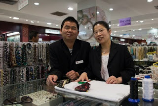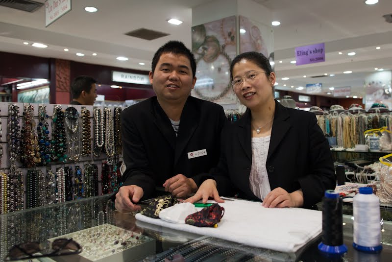 Our first stop was Pearl City, home to my old friend necklace stringing friend Anna. My friend Matt had discovered her via a recommendation of some anonymous lounge dweller at the Hongqiao Renaissance back in 2006. Over the course of our 3 years of work here, our core project team had built her business beyond anything she would have ever expected. Every trip to town meant a visit with Anna, and in the end the recommendations started echoing back to us from people who had heard third and fourth hand and somehow got the idea that they had discovered her. Today we had a few gifts in mind and I wanted something special for My Lovely Wife. We took the stairs and found her busy at work stringing away. After exchanging pleasantries we got down to shopping and she went to work on our choices. I needed some additional cash and she directed me to an ATM that she said was near “the number one gate” which I assumed meant one of the doors. I went downstairs not fully understanding where the particular “gate” was so I asked one of the ladies working behind the gold counters. She wasn’t much help, more or less gesturing that I should go across the street. We went outside and down to where I knew a machine used to be – it was gone, another victim of the constant urban renewal that rules this place. I went back into Pearl City and using my iPhone as a translator, asked another girl. She laughed and pointed over my right shoulder – it was right there by the door. Flush again we went back upstairs and settled up, taking time to take some photos and say goodbye.