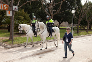 The Jardín was another matter, bustling with runners, cyclists and morning strollers. I’ve been in a lot of urban parks in my time, but this one was nice enough to make you want to move here. We stopped to read a sign depicting what was available in addition to the dedicated running and cycling paths. Along its 10 kilometer length you can find playgrounds, gardens, tennis courts and soccer fields. Just a wonderful oasis in the center of the city. We walked along, watching people and listening to a background of Collared Doves singing in the palms. An occasional parakeet would fly over cackling. We even passed two mounted policemen atop Andalusians, the horse of Spain.