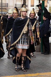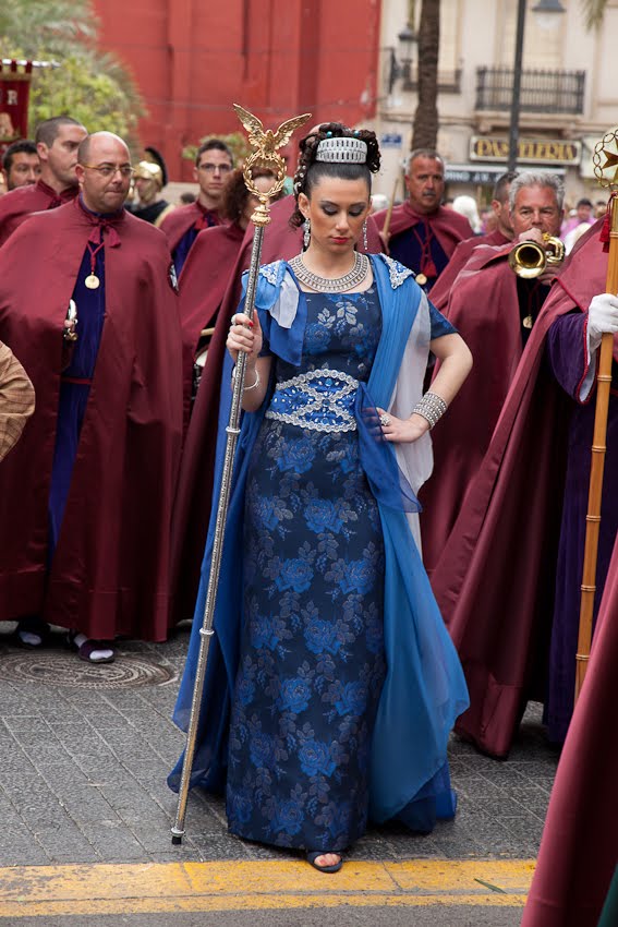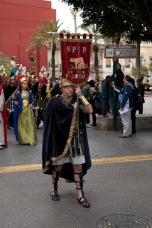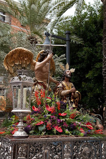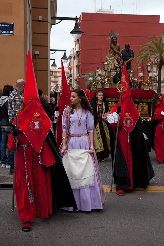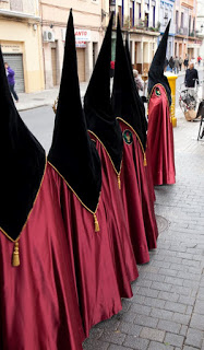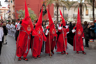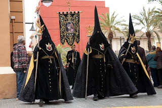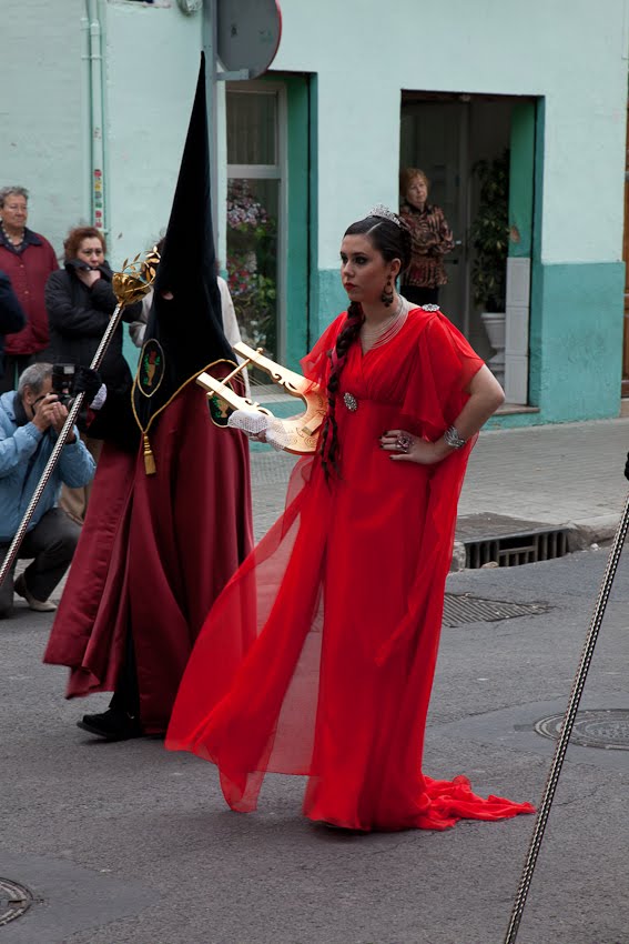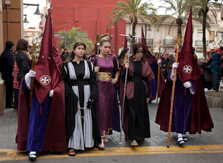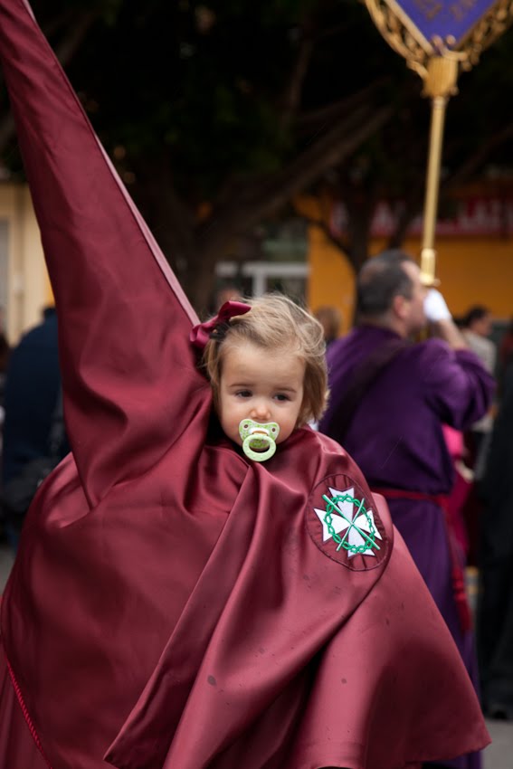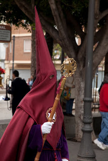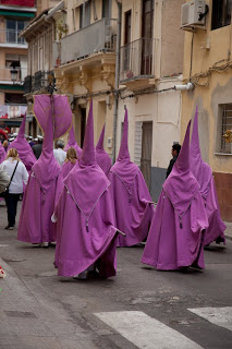 My plan was to find some spot on the parade of the day route and wait for them to come to us. While I knew the parish at the start, I had no idea where it was. The first sign that we were on the right track came when we found a street lined with lawn chairs on the curb. The second sign was a couple of young women dressed in biblical period garb hustling down the street, chain smoking as they went. We decided to follow them. It all came together when we heard the sound of music and trumpets and saw the first of the Hermandades coming at us up a side street, bedecked in purple and white robes, each man wearing the tall conical hat whose style has carried down from the Middle Ages. Trailing them was a small brass band and leading the way was a man struggling to carry a large carved crucifix. We fell in behind and let them lead us to the Parroquia de Nuestra Senora de Los Angeles – the start of the parade.