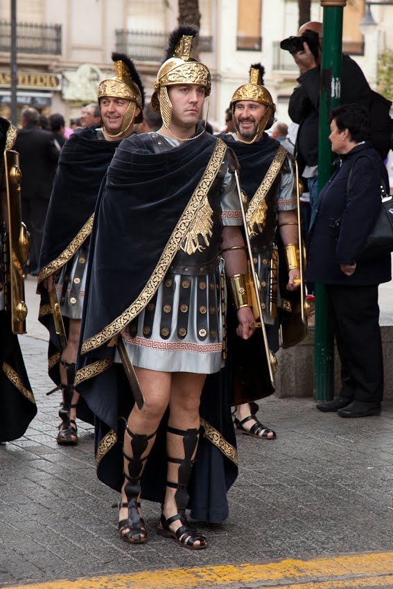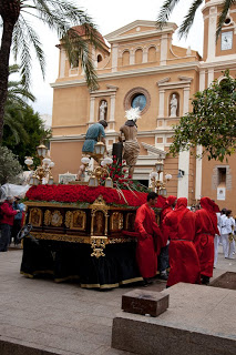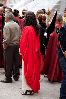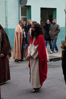 We were close to the 10 AM start time and the church square was unlike anywhere I’d been before. Elaborate imagenes – decorated, carved floats – depicting some element of the Passion of Christ were parked in the middle surrounded by Hermandades in all kinds of colorful raiment. Bands were warming up and children dressed in period costumes were standing around shivering. A person dressed as Christ stood off to the side, hands bound and crown of thorns on his head. The cigarette smoke was dense and choking. At 10 the first group lined up, their band started to play and they exited the square and headed down the street. They were followed by the other societies one by one. I’ve seen these kinds of celebrations all over the world, but this one takes the cake as a feast for the eyes. Reds, gold, whites, blacks, every combination imaginable, at once solemn and celebratory. A window into the ancient mysteries of the region and the Church. I stood and watched and took pictures as the drama unfolded. The poor kids, the most lightly dressed appeared to be freezing and that wasn’t helped by the onset of a slight drizzle. One little girl, dressed in green went by visibly shivering. A group of Roman soldiers and then a band of cornet players in long maroon robes. Just as they began to play, the rain got hard, someone waved his arm and the parade went to pieces – everyone running in every direction trying to find cover. The imagenes were covered in plastic and the Hermandades disappeared down each and every side street. I joined My Lovely Wife under a very dense and accommodating tree and watched to see what would happen. The square emptied and the party was over. We opened our umbrellas and headed back to the Metro, music still wafting down the streets – the bands were now playing in place, under roofs in alleys.