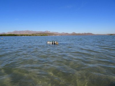 Next morning, My Lovely Wife was off to start work on her homeowner’s association election committee business. I filled my time putting together my kayak and taking to the sea. It was a beautiful morning and for a change I headed out to the ocean instead of portaging my boat around back to the estuary. The sea was not smooth, but I was traveling across the wave line in a way that made it not too terribly bad. I’d first planned to head up the coast a bit and then turn back to the shore and do a loop around the neighborhood mangrove forest. Looming on the horizon though was Isla Blanca, the island I had never set foot on. Knowing I was free for most of the morning, I turned into the wind and paddled out to sea. Blue-footed Boobies were diving on both sides of me and I’d pass the occasional flock of Grebes bobbing in the swells. A crabber was collecting pots and pulling them into his panga no doubt destined for some tourist dinner that very night.