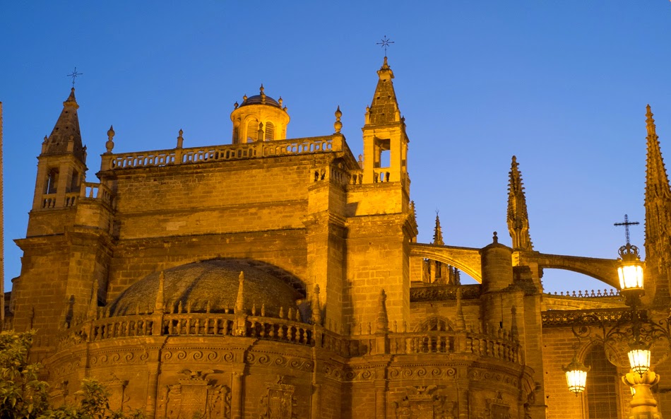 Our train was on time and we killed a few minutes in the station trying to contact our rental agent before grabbing a cab and heading into the old city. I was surprised how fast we got there, remembering a long walk to the station once on last year’s trip. I was doubly surprised to be deposited in front of our favorite tapas bar which is where the provided address turned out to be. The agent showed up and we walked to our place which turned out to be across the alley from our second favorite tapas place, on the first floor of a beautiful building that features a light shaft in the center, bathed in sunlight and bird song. A big step up from last year’s place that had the 10′ extension cord on the microwave that had to be run across the middle of the kitchen floor. We unpacked, took a quick trip to the big market for fruit, bread, cheese, jamon, and yogurt and then headed out to find some dinner after unpacking our supplies. Rather than mess around we went back down the street to our favorite tapas place and filled ourselves up on duck magret, garlic mushrooms, papas, a glass of beer and a copa de tinto. The day wound down watching the swifts wheel around the Giralda as the sun set behind it and categorizing the tourists walking up and down the street, reading menus.