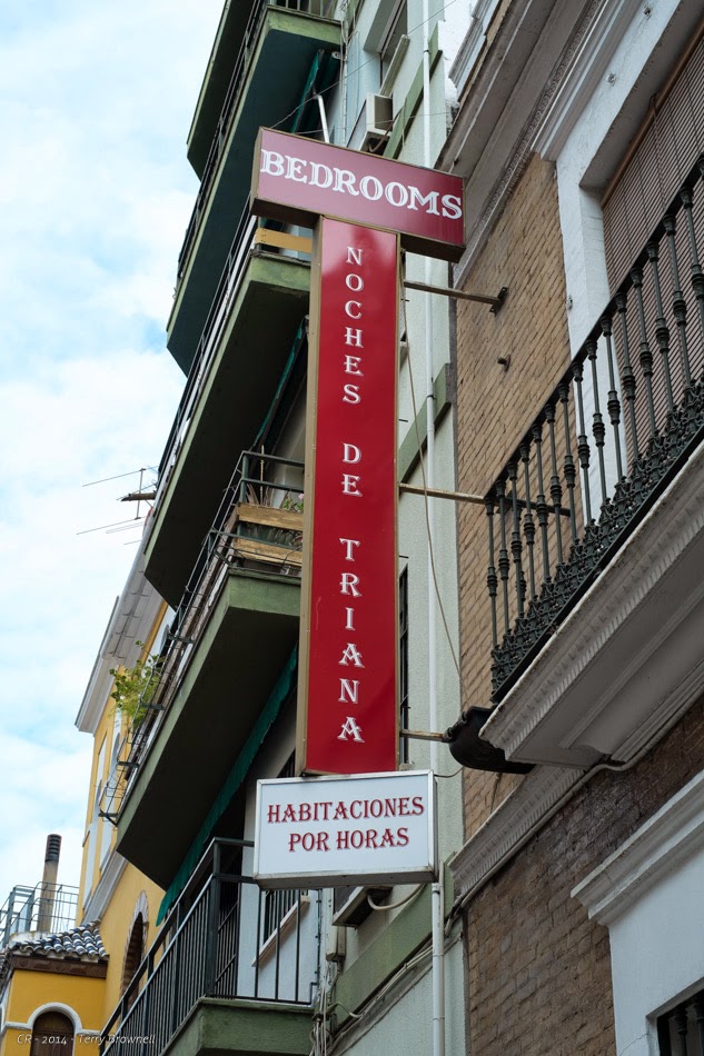 The day began as always with coffee at Las Milagritos, our number one place next to the Giralda. It was empty and pretty much remained that way until a German tour group dropped in for coffee and cokes. From there we wandered down Avenida de la Constitución towards the park and the pigeons. But we never made it, choosing instead to spend a few minutes investigating Sevilla’s rather suboptimal subway system (one line, stops in weird places) and then crossing the bridge to Triana, the grittier part of town on the far side of the river. All the best bullfighters come from Triana which is not surprising. It seems like a pretty tough place. We walked through it last year, concentrating on the highlights in the guidebooks. This year we just wandered through neighborhoods.