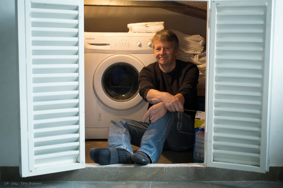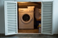 I settled up with Marta although I was 8€ short. She told me to just leave it on the table when we go. No security deposit, no final checkout, pure trust. Before leaving I asked about the clothes washer and she took me upstairs where she opened a tiny set of doors in the far wall. The washer is under the old eaves, tucked in below the tile roof. To use it, you crawl in on your hands and knees after turning on the light. Judging from the towel storage, whoever cleans this place does that every time.