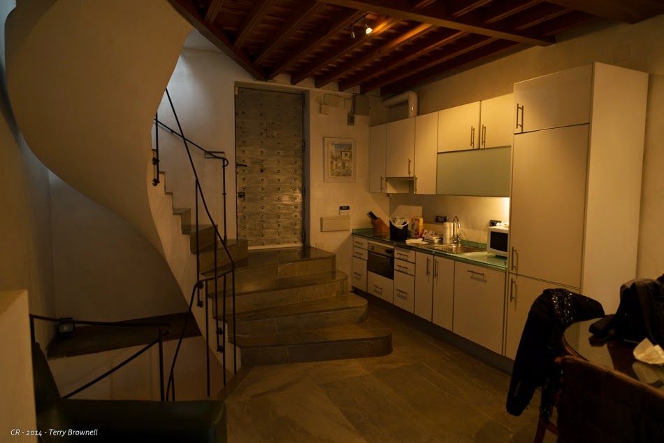 Marta dropped us at the base of a set of stairs that went up to the next level on the hill. She parked and joined us as I dragged the suitcases up the cobblestones that were an interesting combination of ramp and steps. At the top we turned up once again and then came out into a courtyard that was in front of our building.