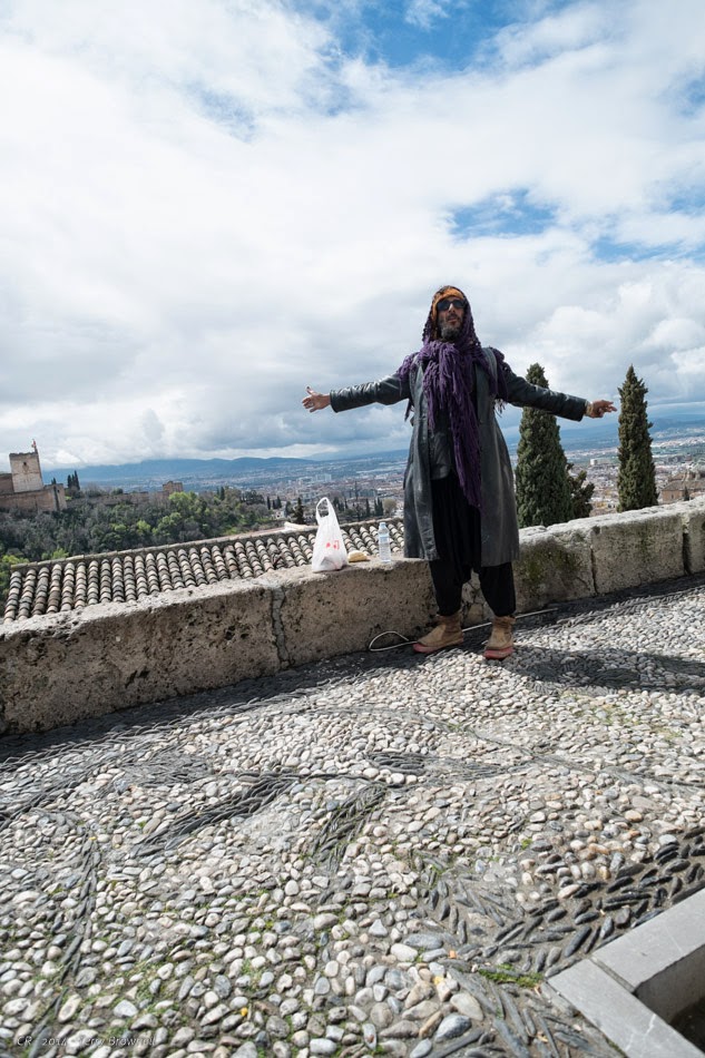 It’s a beautiful plaza with a 180 view stretching from the Sierra Nevada on the left to the valley of Granada on the right. The view of the Alhambra and Generalife was sublime and I could imagine how nice it would be to stand there at sunset as the lights on the walls of the fortress come on. On this morning the plaza was crowded with a school group and some very shaggy hippies, one of whom waited for the kids to leave so he could pick through the trash they’d deposited for breakfast. He found a nice half sandwich and after tearing off the chewed part, he sat down on the edge and enjoyed the rest. We stopped in the 15th century church off the square and purchased some very unique curios.
