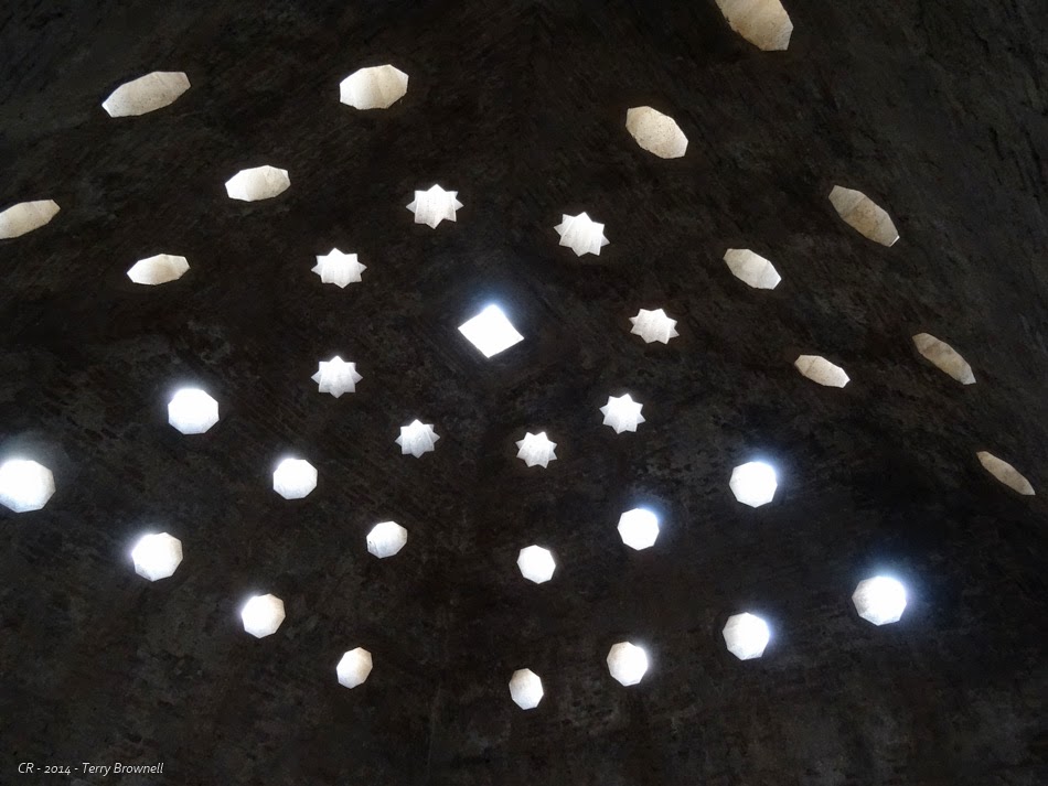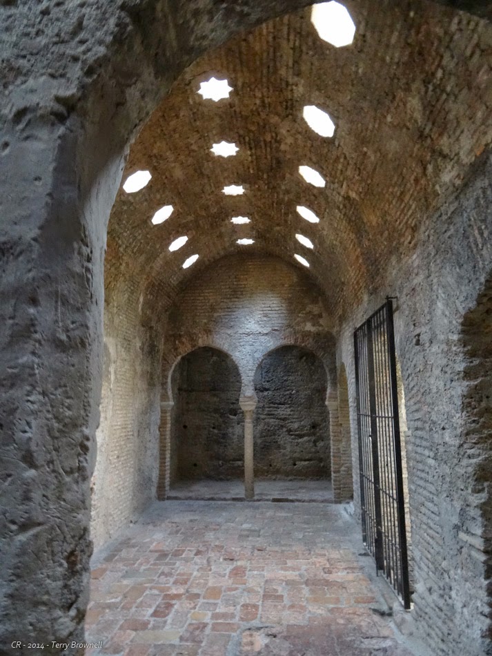 Most of the afternoon was spent at home, eating Piononos and watching the rain come down. It seems that every region in Spain has its private pastry, and the Pionono is Granada’s or more specifically that of the small nearby town of Santa Fe. Like a small jelly roll, it’s comprised of layers of sponge cake rolled up and soaked in some sort of fermented syrup. It is crowned with a big dab of clotted cream and served in a small paper cupcake wrapper. We purchased a box on our first day here and had been allocating them daily and I have to say, they are one of the best dessert specialties I’ve tried, second only to ponche, the Cake of Segovia that is actually pretty similar. As the light began to fade, we went out for a second walk in search of the Mudejar art museum missed on our earlier walk up the river and now found, like so much of Europe, to be “closed for repairs.” Not all was lost though because we stumbled on an excellent little site, free of charge, and that was mentioned nowhere – a very well preserved 11th century Arab bath. It turned out to be quite nice, much better even than the one in Jerez, very well preserved and quite evocative of its original purpose. Located in what was the district of wealthy merchants and businessmen, this was the neighborhood gathering spot. Several rooms, devoted to different temperatures of water, each lit by skylights in the forms of stars and moons. I really enjoyed it, even more so because it was an unplanned stop.