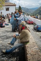 The road turned up at the edge of town and we took a quick spin through the city archives. Not much to see save a beautiful building and peaceful grounds. And a nice break from the 45 degree street. It startled sprinkling again but stopped almost as quickly as it began, a small gift from the rain gods considering our walking surface. About halfway up the hill we passed a turn that went off to the right, to Sacromonte, the original Roma community and home to cave houses and squatting Trustafarians. While it sounded interesting, it wasn’t enough to compel us to add another 10% to the grade so we continued on towards Mirador San Nicolas, reportedly the best view in Granada. At the top of the hill we took a left, dropped down a bit and then found ourselves at the base of the steps leading to the Mirador.