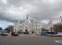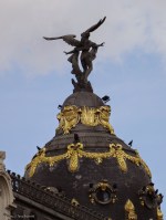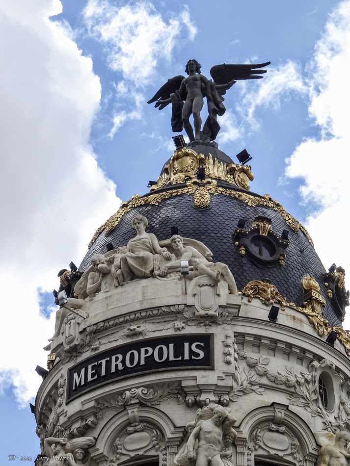 At the bottom of the hill we turned onto Paseo del Prado, stopping to peep through the bars at the Real Jardín Botánico deciding that it deserved a visit on a sunny day. From there we mingled among the tourist throng stopping at Starbucks for an iced drink and then crossing Carrera San Jerónimo we continued up Paseo in search of El Circulo del Bellas Artes; I wanted to get some photos of the world famous Beau Artes buildings that give the circle its name, in particular El Edificio Metrópolis. The walk in front of the Thyssen Museum was as always a challenge due to straggling groups of students who just seem unable to walk and talk at the same time. We whoosh by them and they look at us, wondering why standing 4 abreast on the narrow sidewalk to review a text on someone’s phone is a problem. The Palacio de Communicaciones at the end of Gran Vía was resplendent against the background sky, now blue and gray-threatening simultaneously. Our goal was just up the way so we turned onto Grand Vía into the crowd and started to climb the hill (again) stopping every 10 yards for another photo. What a great building, coated in carved stone that looks like ice cream and topped by a giant copper dome trimmed in gold. Built in 1911, it is arguably the most famous building in this fair city, which is saying something because just about every one of its neighbors is a beauty in its own right.