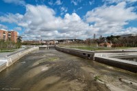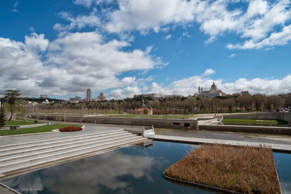 We decided to head off in a new direction, the benefit of having been here so many times before and not having a to-do list. After stopping at Mercado San Miguel for coffee and a tortel de chocolate and watching a tourist family implode because the younger daughter ate all the churros, we crossed Calle Mayor and went down our old street to buy The Times at the newsstand on Opera Square. There were not yet a lot of people out and about, a surprise to me given that it was Saturday. Even the coffee bar at San Miguel had not been its normal 3 people deep. We crossed in front of the Palacio Real and took a stroll through the Sabatini Gardens and then down, down, down the hill and across the Río Manzanares and into the Parque Viveros, an absolutely outstanding urban open space with great view of the Palacio Real and Cathedral that sit atop the hill on the far side of the river. Tons of cyclists whizzing by on a dedicated circuit, kids in strollers, roller-bladers, families walking and pensionistas making a paseo arm in arm, the life of Madrid out enjoying this wonderful spring morning. Every time we find a place like this and spot an upper floor apartment with a se vende sign on the balcony, we start discussing how to rearrange our life to spend half a year here. It was actually getting hot enough for me to shed my coat, for a second time on this entire trip. Crossing back to the city side we struggled up the hill behind the Cathedral past the old Moorish walls and passing pretty well dressed young African men stationed about every 10 yards along the road making us wonder what that was all about. They were milling about trying to look inconspicuous and failing in their attempts. Back up on top of the first of many hills (all of Madrid seems to go uphill) we returned to our old neighborhood for a lunch on Calle Espejo at one of the three places we’ve never seem to have the time for before. I had jamón serrano with tomatoes and MLW had chicken chunks in a red sauce, both served on a really nice soft roll. Washed down with Americanos of course and the perfect choice for watching lost tourists wander by. Two men came and asked for our table as we were leaving, walking Borzois of all things. Big beautiful dogs.