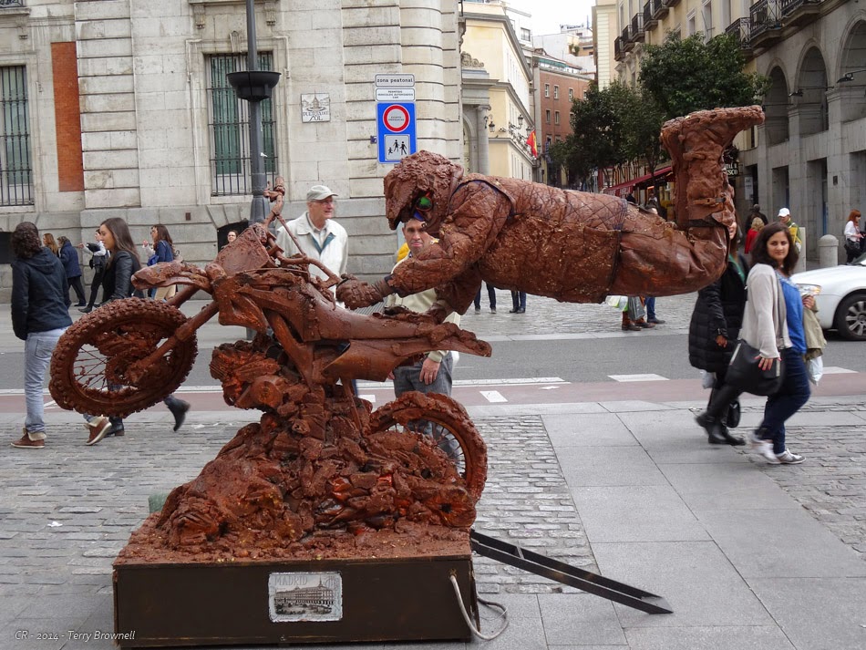 It was beginning to sprinkle a bit as we were treated by a downhill segment into Puerta del Sol, the center of Spain’s road system or Kilómetro Cero as it’s known. We stopped to help a couple of Spanish men with suitcases determine where they were going. Ironic perhaps, but fun none the less. There were many less street performers than I’m used to, replaced instead by people dressed up as cartoon characters including two Smurfs that got me wondering how small the people in the costumes would have to be. MLW took my photo with one performer dressed up as a sailor in a costume made of newspapers. We sang “Sailing, Sailing” to the amusement of people passing by.