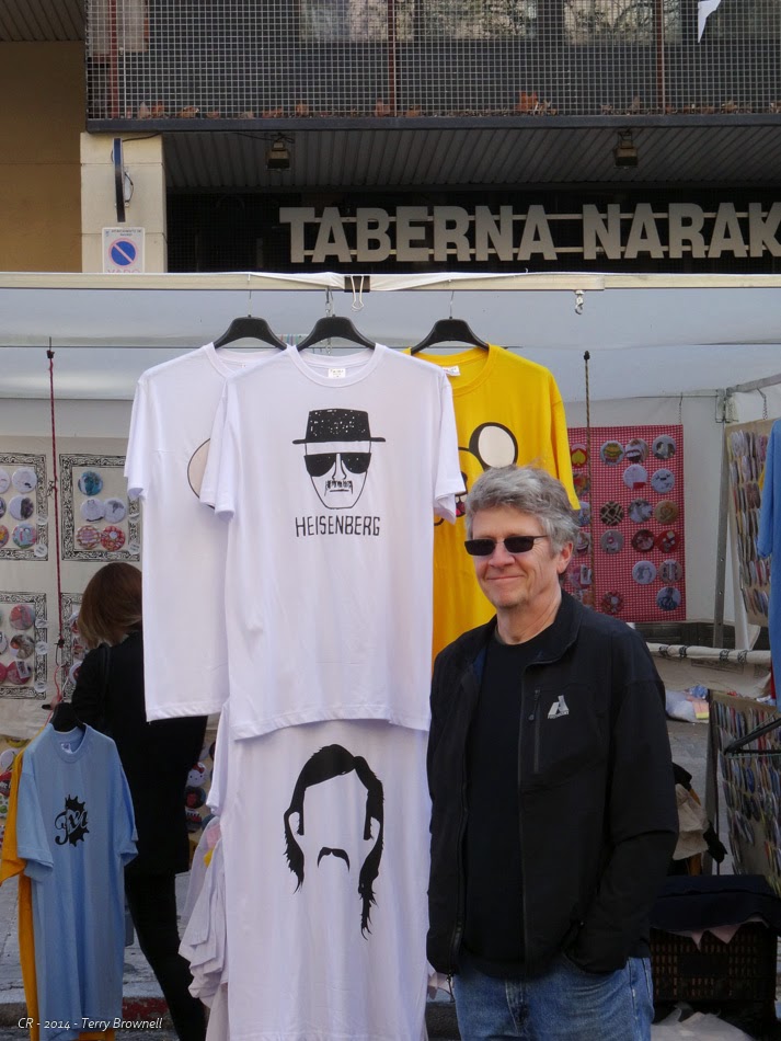 Visiting that most amazing of bazaars has become an annual ritual for us. We don’t buy much anymore but it is so fun to window shop with the stuff running from socks to rubber tubing to purses to antiques to leather jackets and art. It’s located along three main streets and all the ancillary side streets encompassing perhaps 20 square blocks. And mobbed. This year a square at the bottom of the hill was given over exclusively to young men selling trading cards, soccer here instead of baseball. The walking is hard and the climb back up is tough but what a fun outing. I picked up another Palestina, those Middle Eastern scarves that the young guys wear when throwing rocks at the Israelis and MLW got a very unique pair of yoga tights. All that walking had built up an appetite so we headed back to the place we had lunch yesterday for a second round of those really great melotes that had filled us up on yesterday’s outing.
