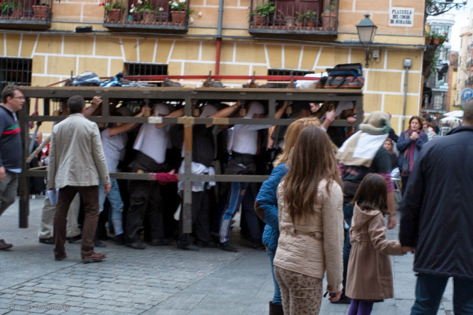 Around 8 we went up the hill past Mercado San Miguel and down the other side to Mandela, our absolute favorite restaurant in Madrid. We went 2 or 3 times last year and became fast friends with the staff, spending a lot of time talking about African politics, drinking beer from Mali and listening to music. We went back a couple of days ago to make sure they were still in business and promised to return. Along the way we cut across a plaza and saw a large group men practicing for the upcoming Semana Santa. Each wearing a white headdress like that of a Pharaoh, 25 or so of them were climbing under a large wooden platform topped with a big ring of rebar. With a shout, they lifted it so that some long support beams on the inside would rest on their shoulders. They began to inch forward until they reached the end of the street where the command was given to turn right. Each man started to do a little side step, all in unison until the platform began to head right. I can only imagine how exhausted they will be on the day of the procession, carrying the holy relics from their parish in the parade, concealed in this giant framework of wood.