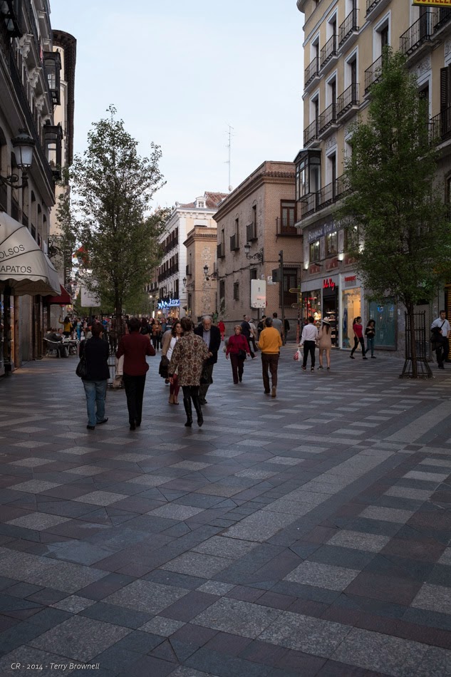 The main square in front of the Palacio Real was empty so I stopped to take a photo. We crossed Bailen and headed up Arenal, trying to decide on somewhere to eat. We kept on going as nothing really appealed to us and when we reached Puerto del Sol we crossed and went up into the hills. The side streets were surprisingly quiet. We stopped to have a look at the front of a religious materials store, suppliers to the marchers in the Semana Santa parades. There was a very ornate Jesus in one of the second floor windows, life sized surpassed by an even more spectacular Virgin to his right. At the top of the hill we turned onto Las Huertas and went looking for Plaza Santa Ana on the off chance that we would want to find a place for dinner. A very fancy ultramodern hotel on the northwest corner announced the place, but none of the restaurants looked all that appealing. Retracing our steps we went back to the local’s place where we’d eaten two nights prior, choosing the cod with tomato tapa again and adding a pork loin with melted cheese as an accompaniment. Both were excellent.