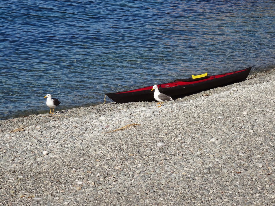 Landing here is a challenge, because there is no beach in the traditional sense, rather a steep bench of black rounded agates. The rollers I’d encountered out on the bay were breaking hard here so I had to plan my approach. I angled in, stopped paddling and instead used my seaward oar as a rudder and guiding my boat into the calmest portion, pulling in parallel to the rocks instead of nosing in. The boat came to rest in the shallows, I scrambled out and tried to get a good footing on the agates, finally managing to get stable. I lifted the boat out of the water and left it well above the water line and took a moment to watch the last of the Cormorants fly by.