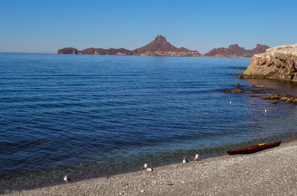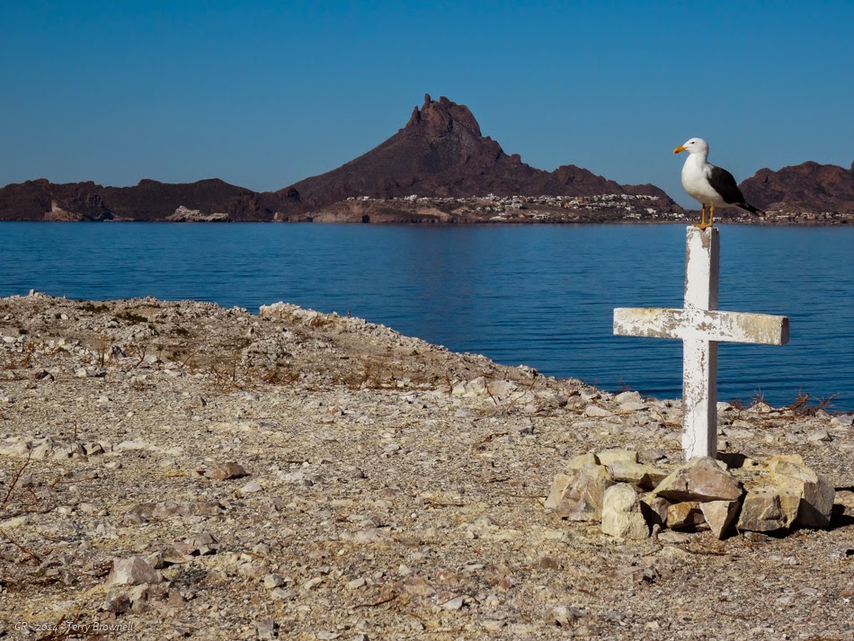 Since this island is little more than a stinky speck in the ocean, one might ask why it’s worth the trip. There is nothing there but a cairn made of flotsam, a cross memorializing who knows what and a lot of hot rocks. I suppose the answer is “Because it’s there” and for me that’s reason enough. I climbed up to the highest point, added a few rocks to the cairn, took a few photos and wandered down to the other end. A pair of women in a tandem paddle kayak slowly passed by off to my south while a Mexican fisherman in a Zodiac tended to his crab traps on the seaward side. Other than that it was completely silent aside from some distant barking that might have been either a seal or a guard dog at some questionable sea front mansions a mile off to my right. So I strolled around, enduring the scolding gulls and finally got back in my boat and pushed off. The launch was far easier than the landing.