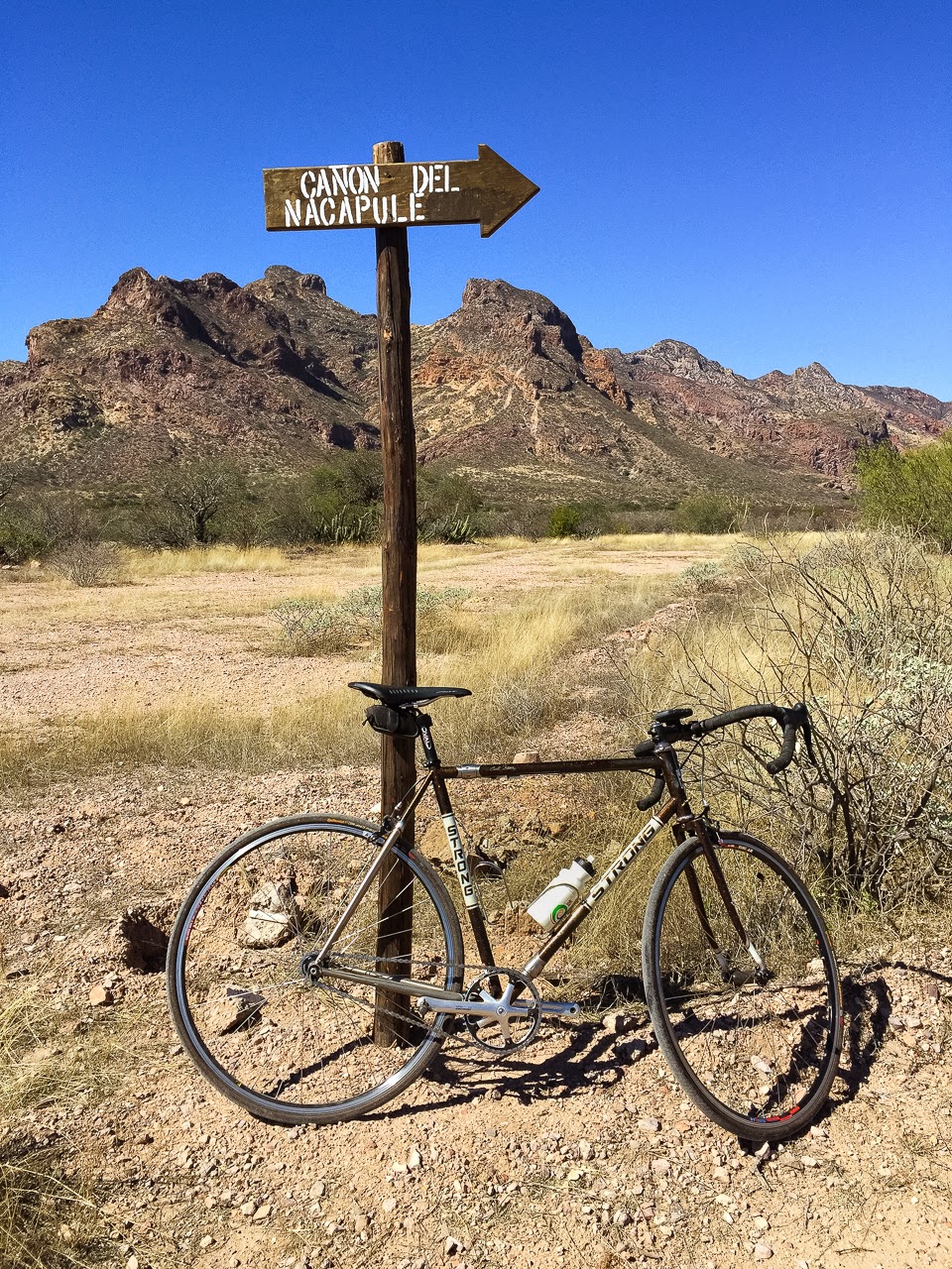 Riding in Mexico is more or less comparable to riding in the States. The loose dogs aren’t really interested and the drivers are largely respectful, as long as you avoid roads where it’s easy to drive a hundred miles an hour. That’s what really cost me my original route – a formerly little used shortcut from San Carlos to Guaymas that became a narrow two lane race track once it was discovered. Just too much risk from close pacing racers to make the ride enjoyable. This time around I thought I’d use the main road into town that has a nice wide service road as the approach to going off into the wilds north of town and leading out to one of our favorite birding spots – Cañon de Nacapule. To meet that need the bike I chose was a single-speed, dirt-road bike that had served me well when I rode around Northern China.