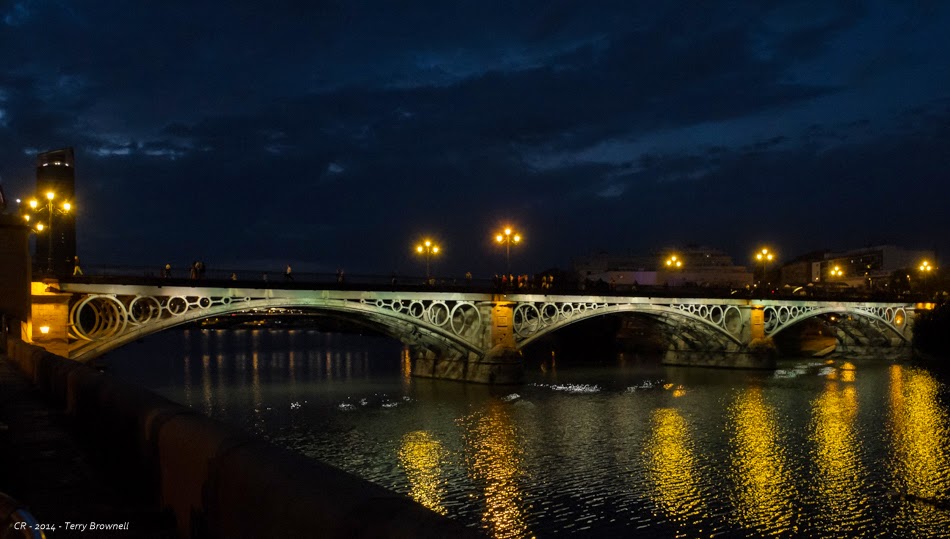 It’s a bit of a walk but once across one of the bridges that bracket Triana, life changes immediately. We chose a small café with tables lined up along the river and had a nice meal of fried cod, ham croquettes and broiled mushrooms. The people around us were all locals, many taking about work or their days, a much more real-life experience than can be gained in the bodegas of the old town. We sat and talked and took a long time enjoying our meal, not having smokers walking by or tour group members checking out our meals. The sun went down, the lights came on and our masterpiece of a bridge, Isabel II, was suddenly bathed in pale blue light. The last of the kayakers on the water went wherever they were going and La Giralda was clearly visible to the east, brightly shining yellow above the low roofs of old town and the bull ring. A really nice evening.