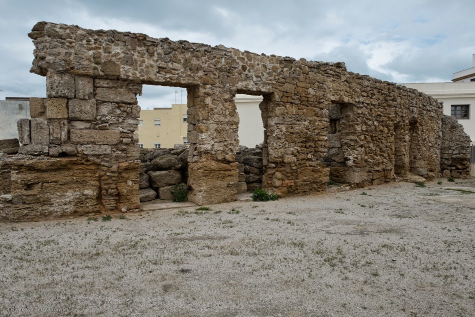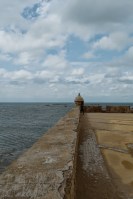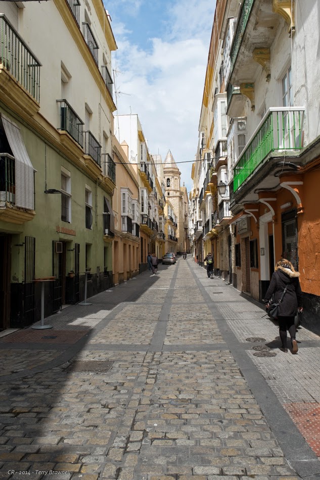 We’d checked the weather report when we left and my assessment was that we would more or less have a decent day. That notion was dashed as we traveled further south where the sky was choked with dark gray low moving rain clouds, taking the opportunity to douse the train windows every couple of miles. The fact that most of the trees and bushes were essentially bent over double wind didn’t bode well either, and when the train made a broad sweeping right turn onto the peninsula, the white capped ocean closed the case. On one side of the train we had the Atlantic, stretching all the way unhindered to Massachusetts. One the other, extensive docks and container handling cranes, reminding us that Cádiz remains one of Spain’s busiest ports. Far off across the lagoon I could see a big transport plane lumbering up into the wind, having left the US military base at Rota.