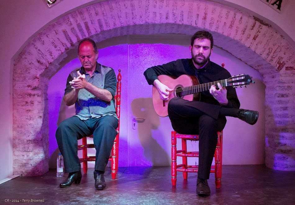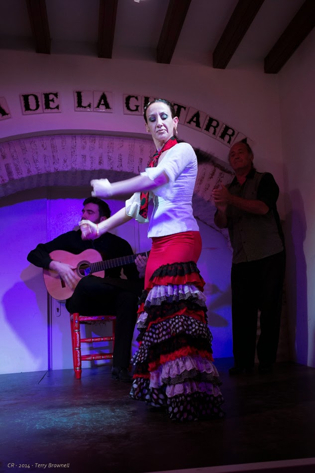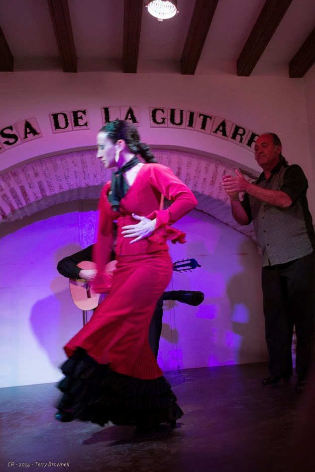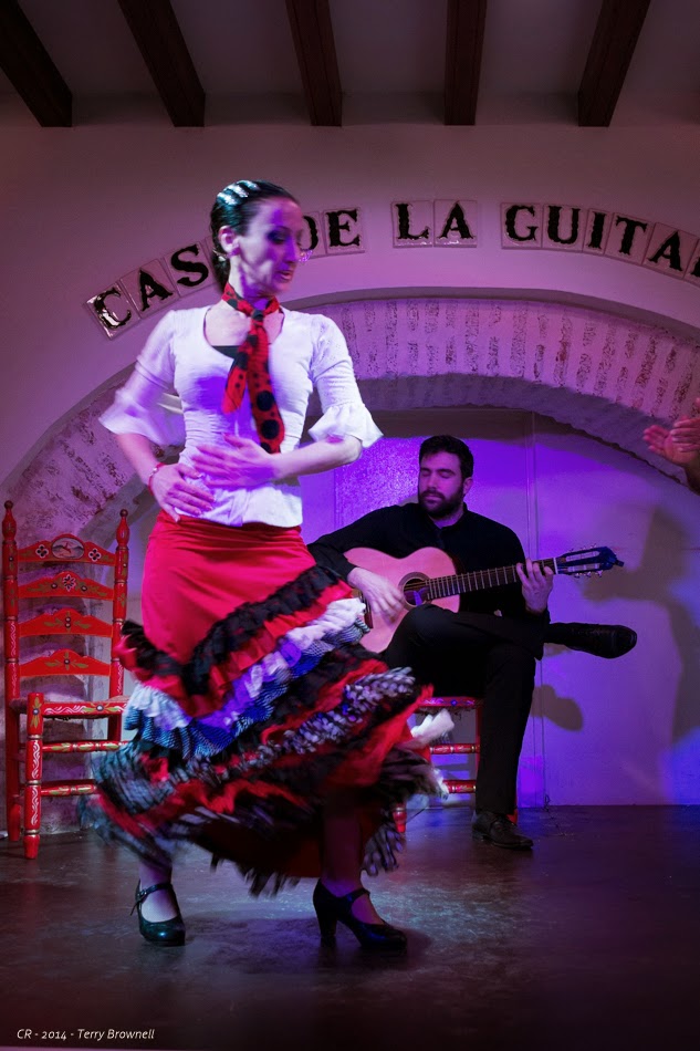 After a few hours of drying it was time to head off to our favorite Flamenco show at Casa de la Guitarra, just around the corner from our apartment. This would be our 3rd visit, and we keep coming back because the music and dancing are so very good. Simple, straightforward and great to watch. There are a lot of places in town that offer their version, but from what I’ve gathered they’re far less intimate (this place has maybe 40 seats) and far more expensive (usually involving food and drinks) and more a spectacle than a show. For our $18 euros we get a guitarist, singer and dancer doing a total of 5 or 6 pieces. About an hour, maybe more, but really hard to beat. This year we had the same guitarist as the first time we went and different singer and dancer. There are some 40 styles of Flamenco and most of what we heard on this night was in the style of Cádiz, a nice little connection to our trip of the previous day. Their Flamenco tends towards the happier, lighter side and not like some of the gloomy-emotional pieces we’ve seen in the past.