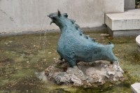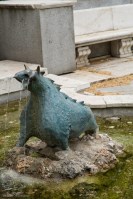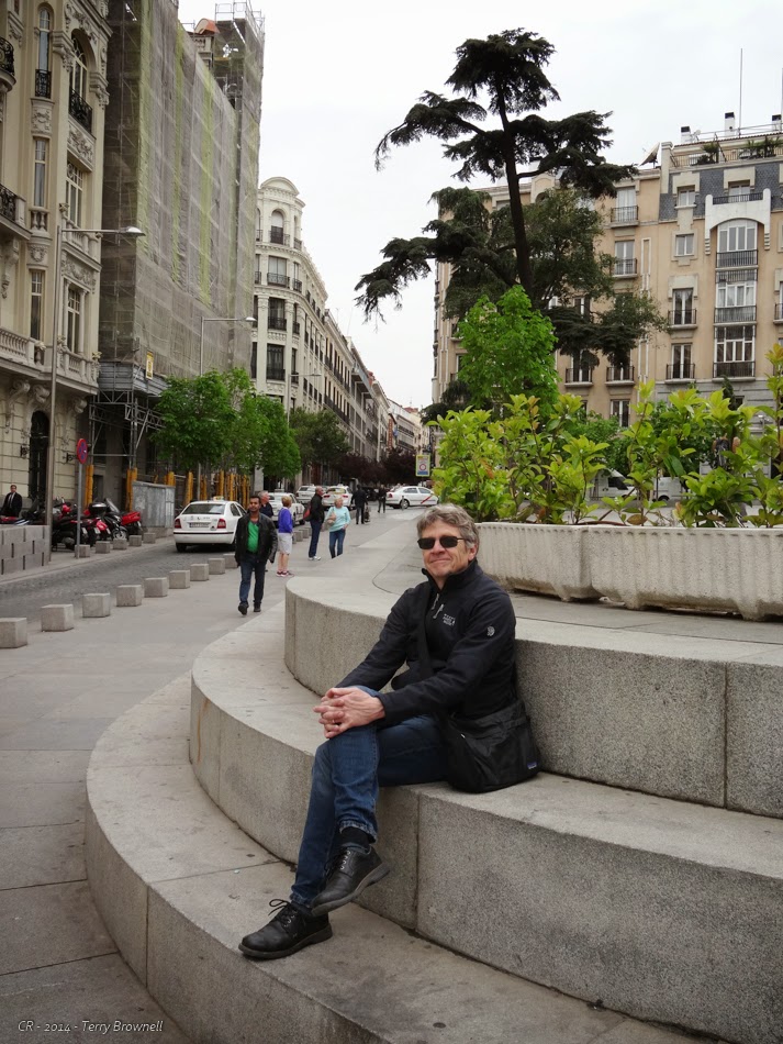 We really did stop at Starbucks for dilution and from there wandered down to the Paseo del Prado where we grabbed a bench to enjoy our drinks. We sat opposite a fountain with a water nymph giving the “sit” hand signal to some sort of alien creature with three nipples on its face, dispensing water. Slug? Dragon? Who even knows? A young woman came by with a pair of some kind of Mastiffs which she freed to run around on the grass patches that were clearly marked “No dogs.” To her credit, she did clean up after them, including using a paper towel to mop up the grass when one of them peed.
