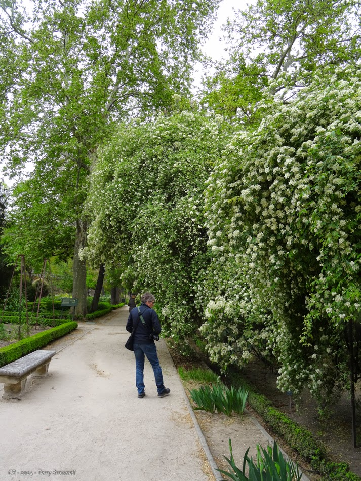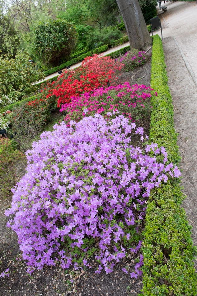 The gardens are a great place to spend a last day before traveling. Peaceful, mostly quiet (aside from the groups of elementary school children running around screaming) and full of good energy and fresh air. Lots of bird song and beautiful blooms. We were lucky this year because a lot of the spring flowers were still in bloom, along with many of the trees and quite a few Rhododendrons. Our favorite plot, the vegetable garden, was replete with as much chard as I’ve ever seen. We walked from one end to another and then back until we’d covered the place from top to bottom. And just like that, it started to rain as we were heading to the exit. Crossing the Paseo we stopped in Starbucks for a coffee and a sandwich to split before heading back up hill along Paseo de Lope Vega and Las Huertas.