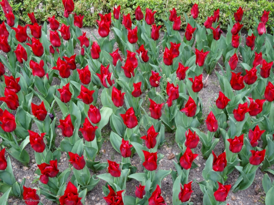 It was getting cold with low gray clouds blowing past and a moderately stiff wind picking up. We got up and crossed the street towards the gardens, only to get stalled by a very large group of teenagers, mostly boys whom were heading into the garden. For the life of me, I could not grasp why any tour leader would think for even the shortest second why a bunch of teen-aged boys would be interested in a spring flower display, but there they were. Once they passed through the group gate we went on, dissing a woman who was trying to sell us a package of greeting cards for the purpose of helping the elderly disabled children.