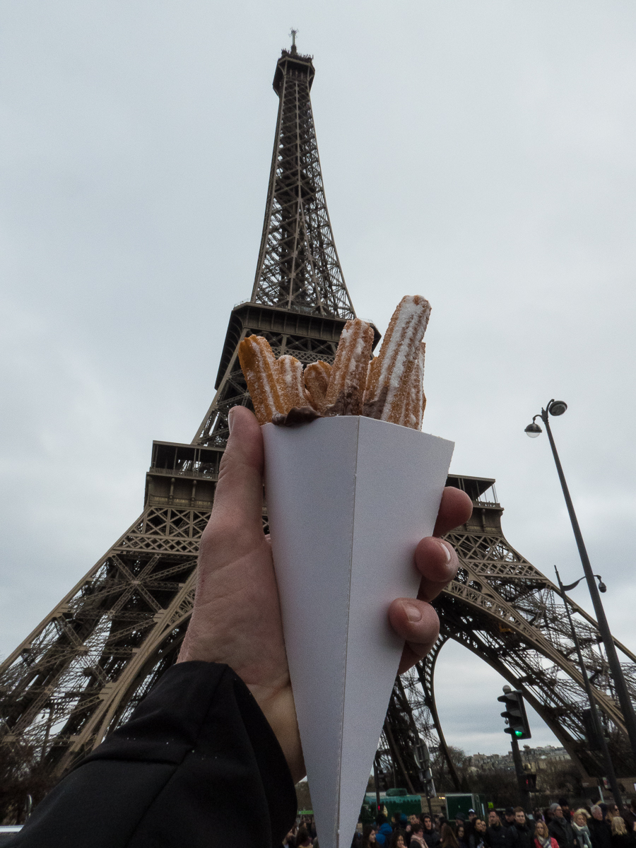 With every multi-time zone trip there comes a moment when you really want to go to sleep but know you should tough it out and stay up. Our solution – go shopping. We headed down to our favorite Carrefour from our last trip and stocked up on cheese, yogurt, fruit, and baguette. After a short snack we decided to go hunting for Churros, because what says “Paris” like a hot cardboard cone full of fried dough and Nutella?