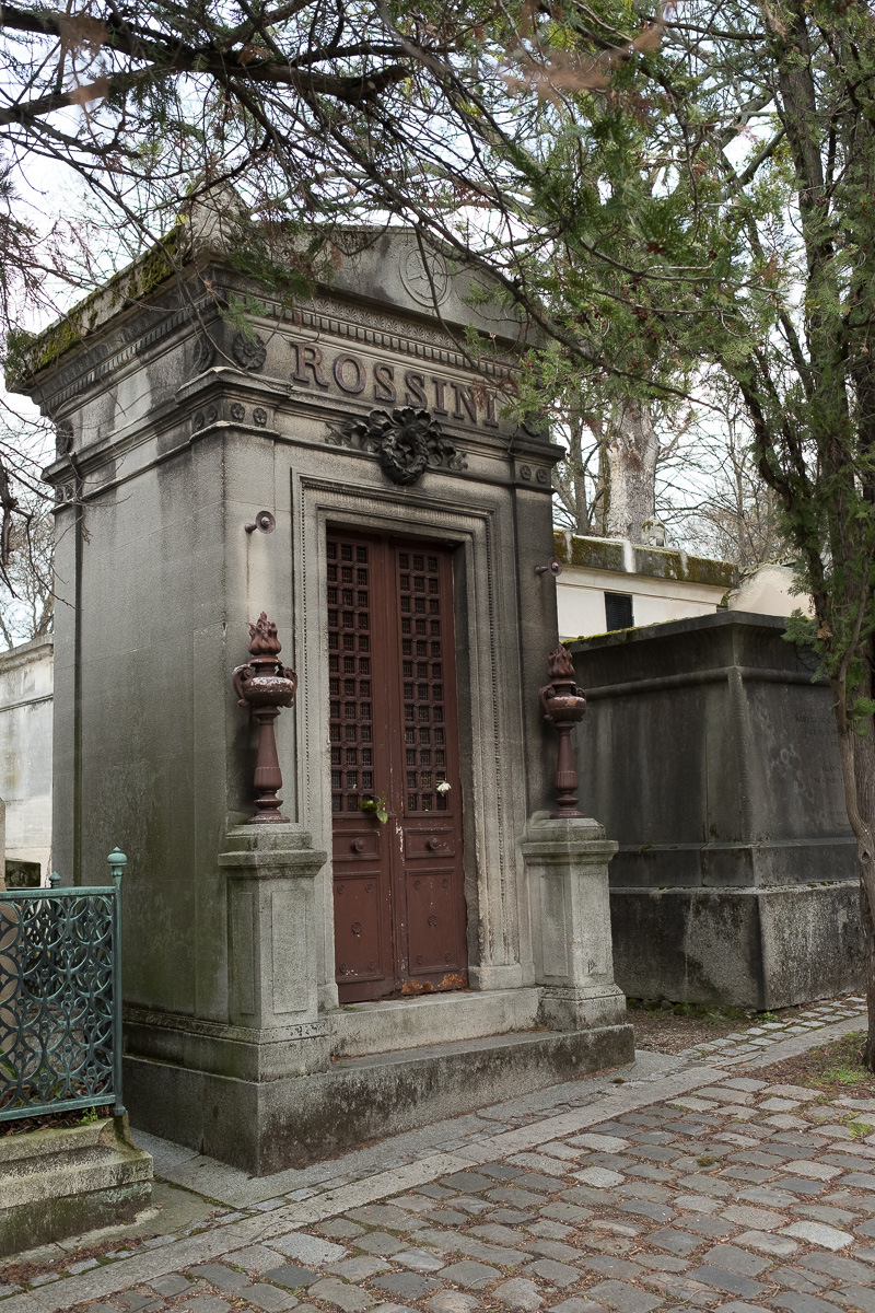 We started with the grave of Gioachino Rossini (1792-1868), well-known Italian composer of operas and one of my favorites. His “Thieving Magpie” is a staple around our house. His grave was very easy to find, being about a hundred yards in on the main entry and right on the edge of the walk.