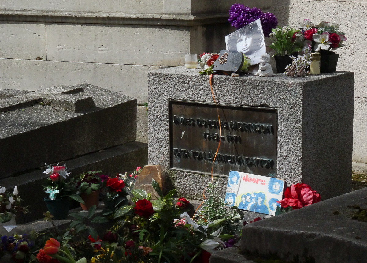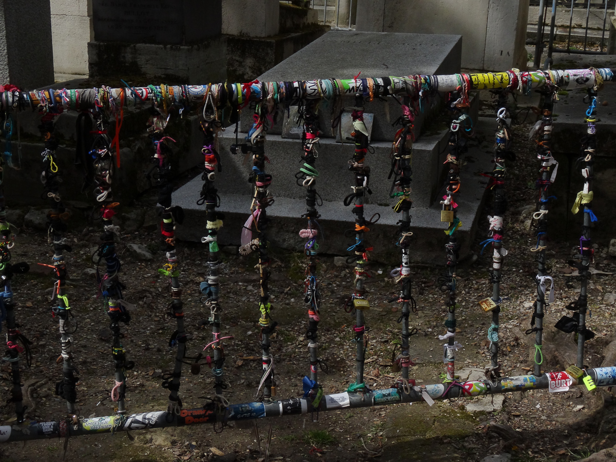 Unfortunately, one of the biggest draws is the grave of Jim Morrison, front man for the Doors who died here in 1971. Many fans believe he faked his death and lives on, somewhere. Regardless of the myth, his grave is sort of ironic. Much abused over the years with thefts, graffiti and vandalism, today it is protected by some metal crowd barriers festooned with those cheap little hippie bracelets you find in tourist shops. Everyone there paying homage was clearly born several decades after he went to his reward, so their passion is a bit humorous, at least to the two of us who were around when his band was a sensation. The grave itself was not much to look at, tucked in behind the tombs of mere mortals.