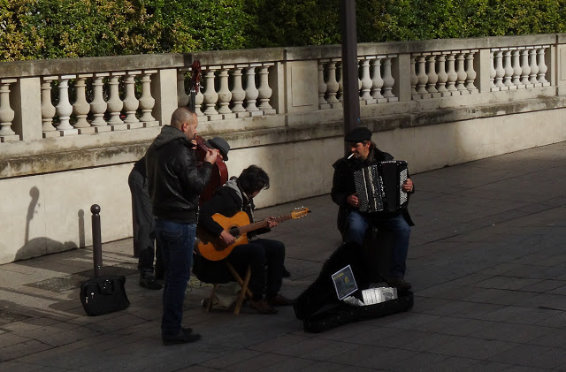 The sky above our airshaft was a shiny, beautiful blue this morning so we decided to take the short walk up the street to the Musée d’Orsay. When we’d been by on Easter Sunday, the queue was huge and we figured that today, being a Tuesday, it wouldn’t be. We were wrong- the tail end of the line was at the “30 minutes from this point” point so we turned around and walked home, stopping for just a second to listen to a faux Gypsy jazz quartet playing by the museum stairs. The decision was easy since I’d forgotten my wallet and we would have been reduced to charging our tickets. And now that we were outside and saw that the blue sky extended for some distance in all directions, the thought was that it might be better to use the day for something outside. Museums are always open on rainy days.