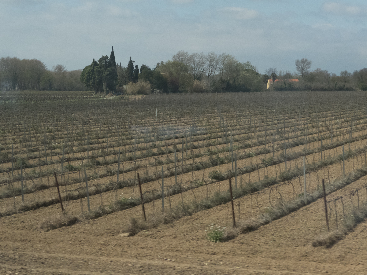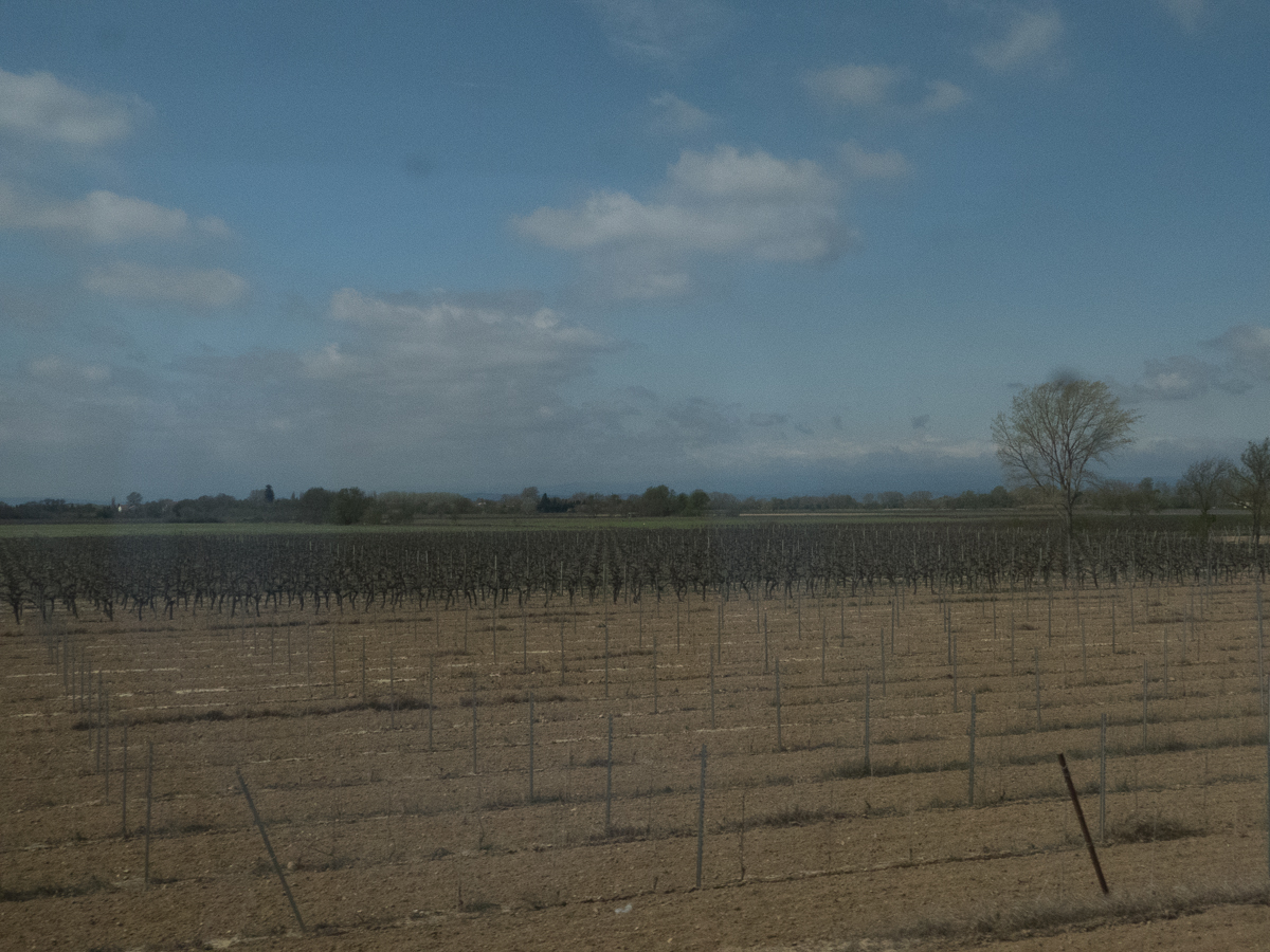 The weather had degraded, even more miserable with roving sheets of rain driven ahead of a strong wind. I was glad to be watching it from the inside, unlike yesterday’s soaking adventure. The fields looked the same but the architecture was changing. Farm houses here are constructed of blond limestone blocks unlike the grayer stone materials we’d passed on our way south. The sights were quickly becoming Provençal. The woman in the seat in front of me had made a big show of constructing a sandwich out of a baguette and a pile of meat she’d produced from her handbag. To counteract the creeping deli smell, we peeled a couple of tangerines and opened a bar of Lindt. Out the window, the landscape was changing too – scrubby plains punctuated with some yellow plant in bloom and small rocky hillocks. MLW observed that the south of everywhere has a tendency to look ratty. Now groves of olive trees and vineyards started to appear, announcing that we were moving closer to the Mediterranean.