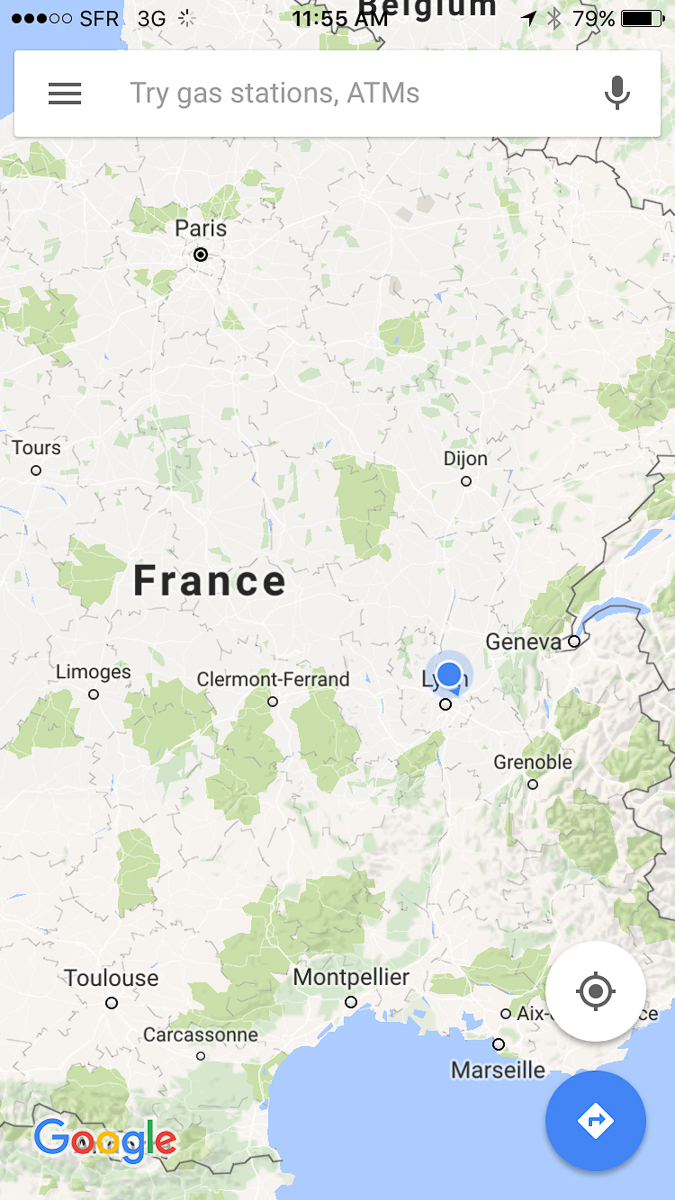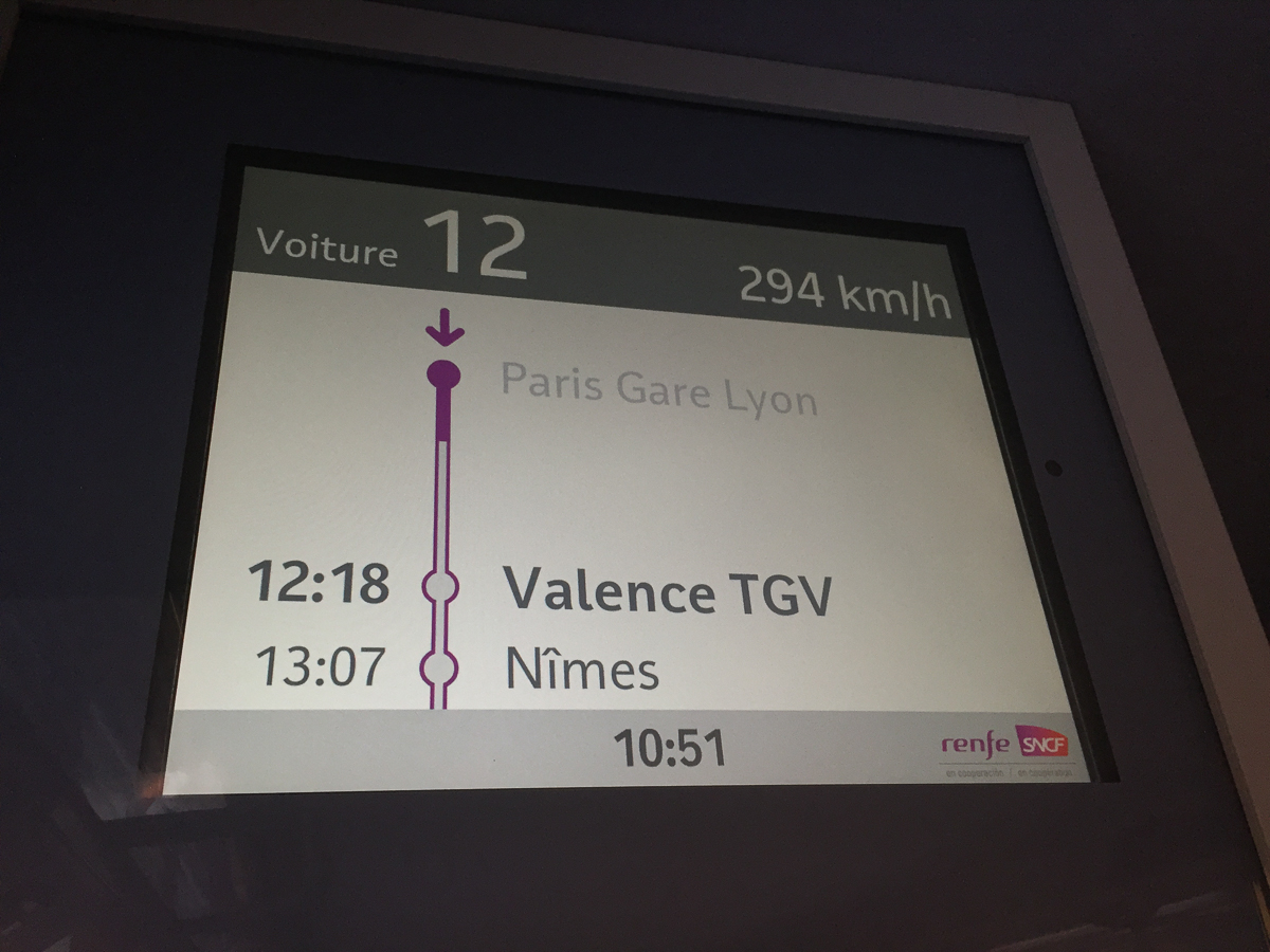 According to the map, we’re just outside Lyon, almost all the way across France. There we will make a broad turn to the west, heading southwest towards Barcelona and the coast, taking a route that avoids the mountains. It looks as though there is a series of stops after Valence, no doubt the reason we make the first half of the trip in 2 hours and the second half in 4. We arrived on time and lost a few passengers and were on our way after only a few minutes.