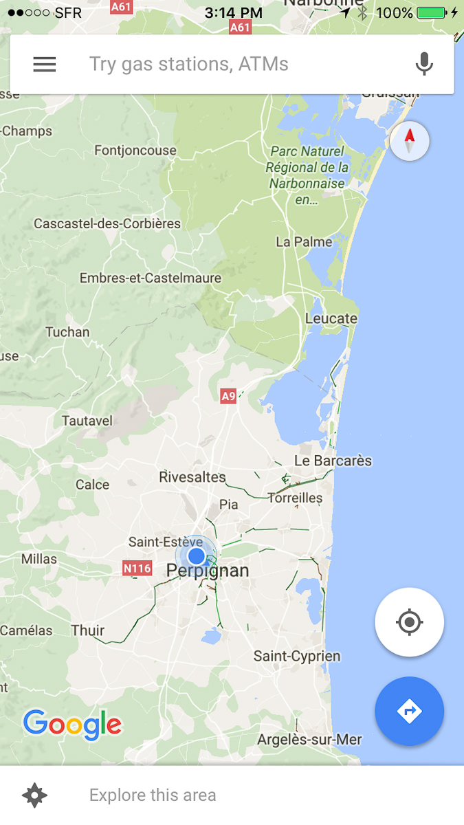 Beyond Montpelier the route followed a barrier island between the Mediterranean and a large estuarine bay called the Étang de Thau. Google Maps sort of lost it here, thinking we were either still on the mainland or out in the middle of the water. The cottage housing looked like that in beach communities the world over, only with a local twist – orange stone, red tile roofs, side by each and boarded up for the cold season. It reminded me a lot of the train ride we took last year into Cadiz, and I suppose that all train rides down to the same look about the same. The sea was too far to our left to be seen, but the sky was finally brightening up. The sun was finally making an appearance in a sky now partially blue. Far off to the right, the blue foothills of the Pyrenees were now visible.