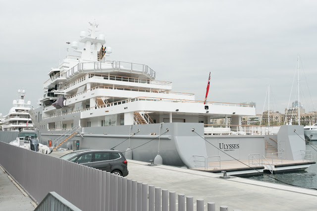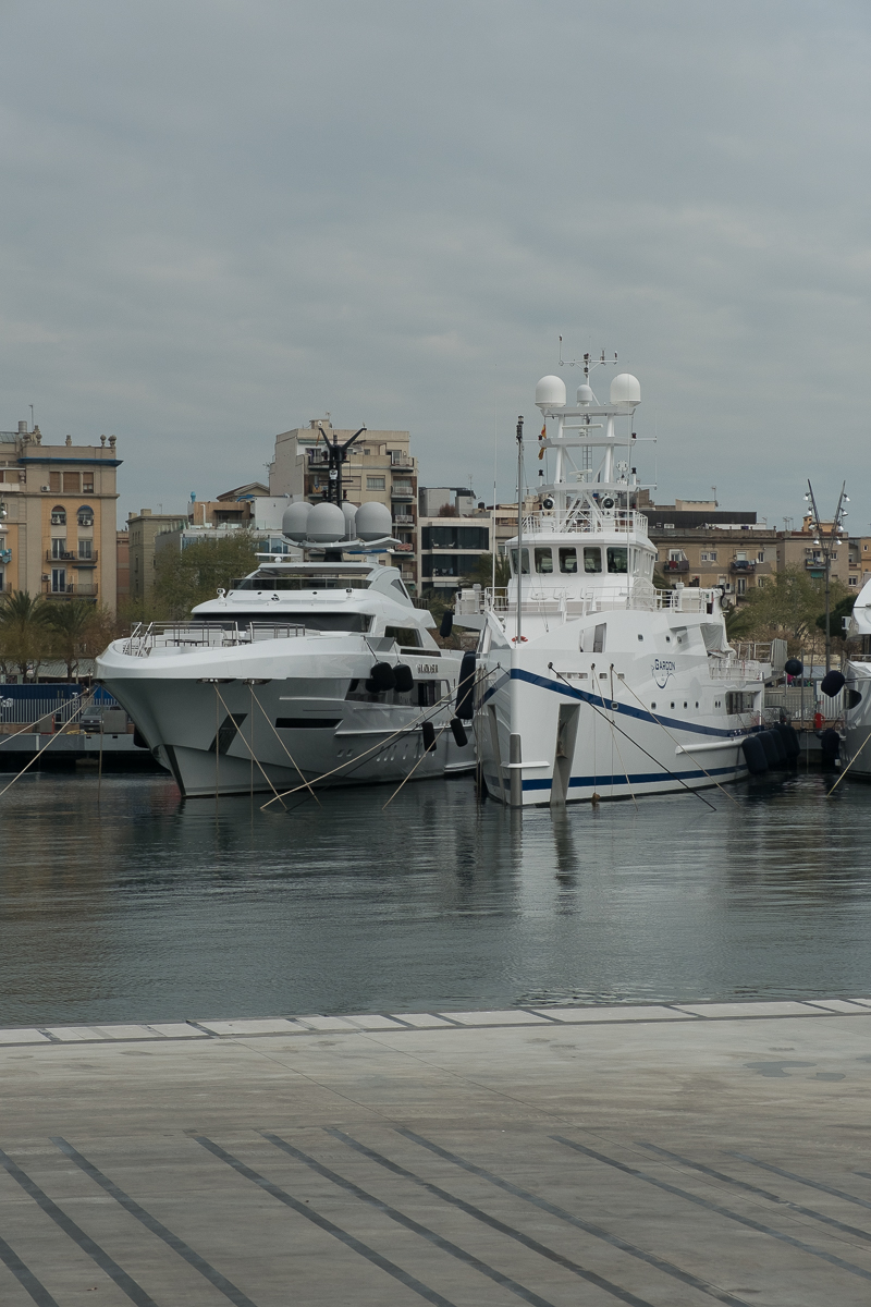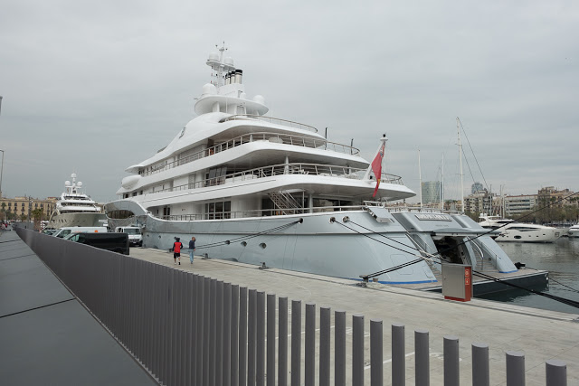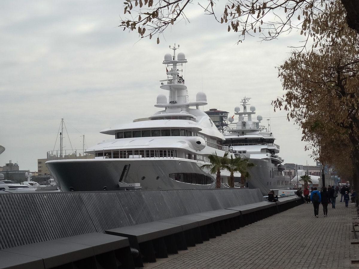 Today’s plan, after finding an ATM that didn’t expect a 5€ tip for giving me my money, was to take a long walk up to the Eixample district to see some commercial buildings done by Antonio Gaudi. We did that, and had a nice time of it. But before you hear about that adventure, and the subsequent walk down to the Mediterranean, you will be treated to a special blog about the Billionaire Boats of Barcelona.