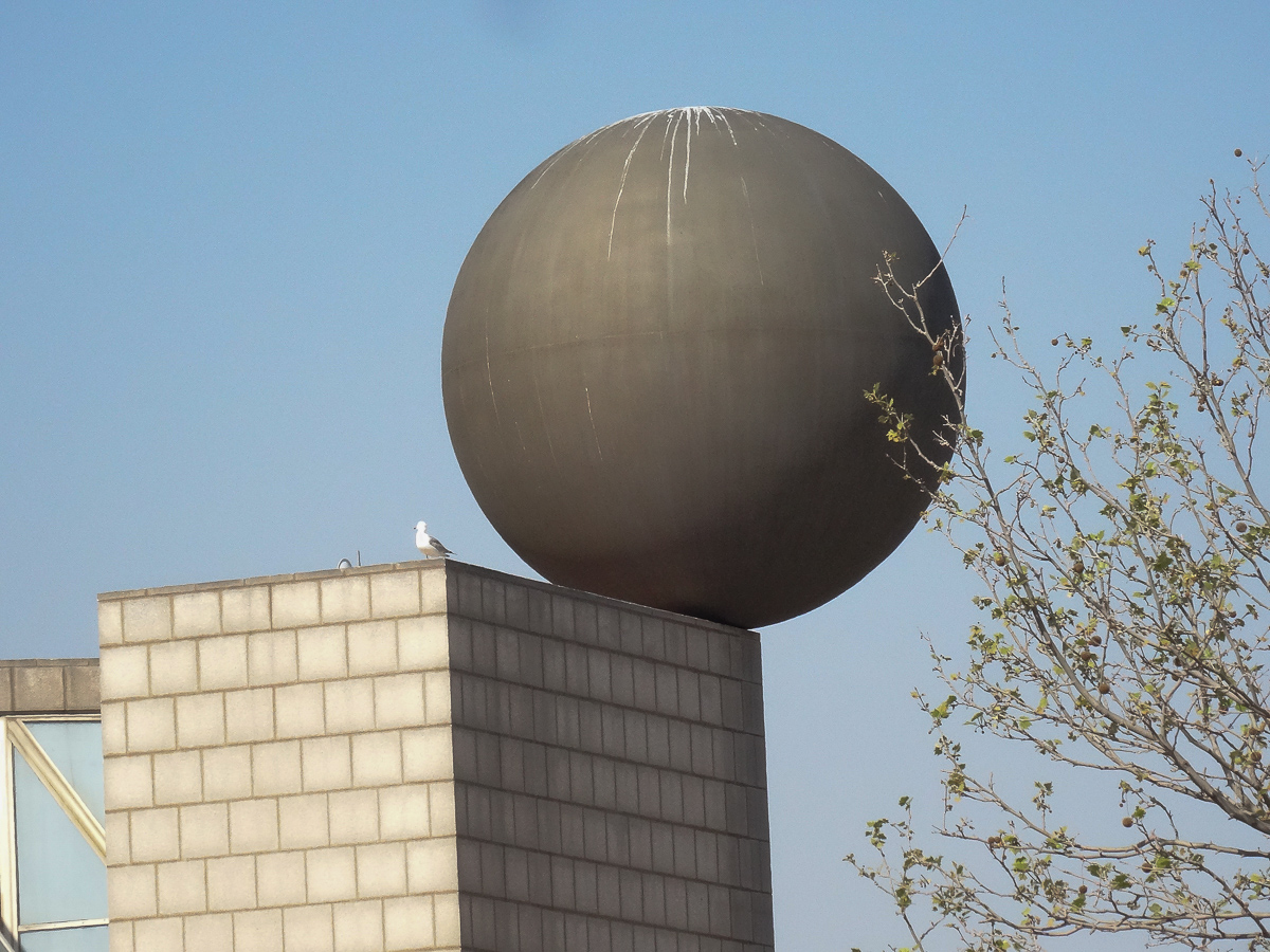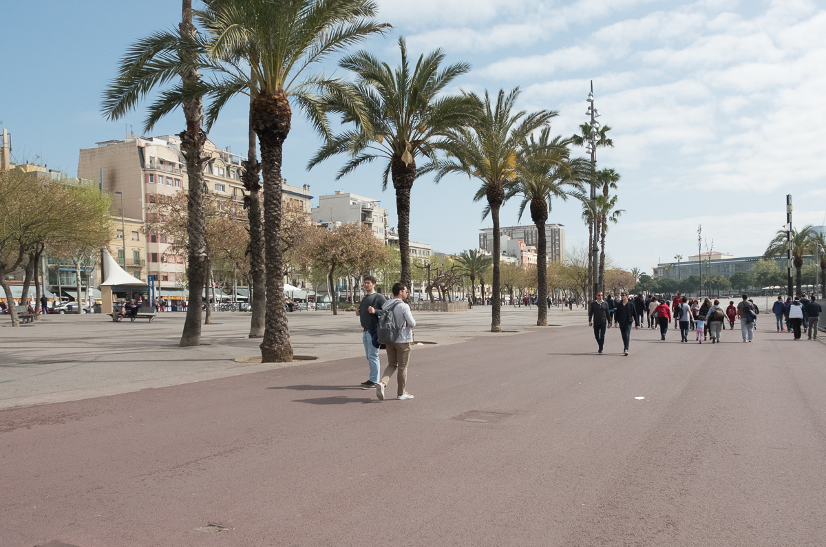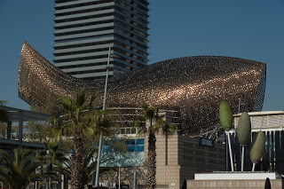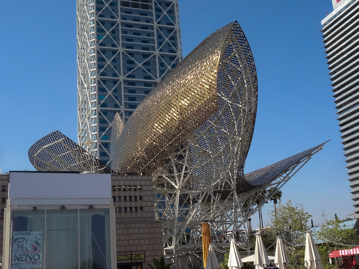 Moving on we made sure to find a decent shot of Frank Gehry’s Goldfish sculpture, installed for the 1992 Olympics and hovering today over a handful of tacky tourist shops. Made of gold metal straps and shining in the sun, it looks as though it wishes it could break its earthly bounds and hop over the stores blocking its escape to the blue sea beyond.