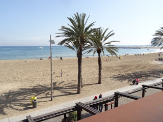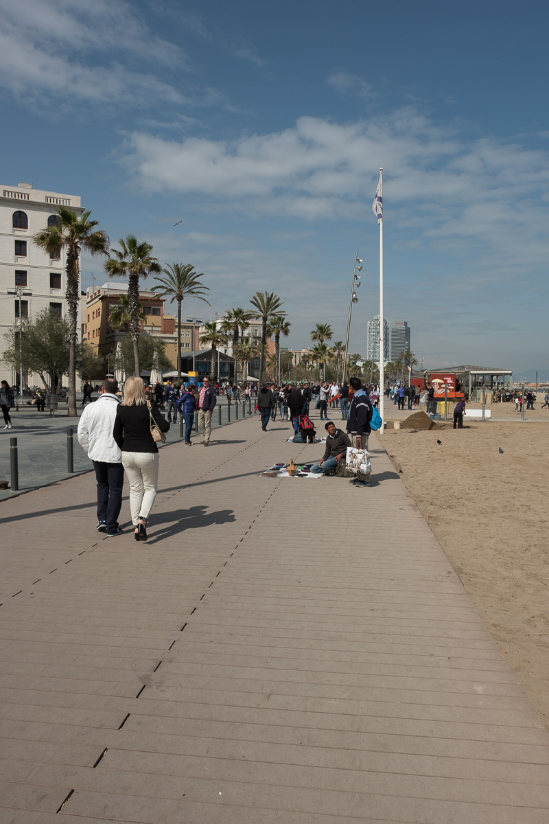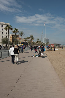 The promenade that leads down to the beach and Barceloneta curves around the more modest side of the harbor – in other words the backside of the 65 meter yachts. The timbre of this place was very different – it was just like urban seasides everywhere. Tons of tourists, lots of waterfront restaurants with heaters or glass panels to fight back the cold. A completely different scene that what’s going on in the old city just across the street. We took a long stroll along a pretty nice boardwalk watching the jet skiers, bathers lying in the sand in their down jackets, young people shielding their eyes as they sat on chaise lounges playing with their phones. A typical beach scene. We stopped for a glass of wine at one of the boardwalk restaurants and I watched the young bartender as she created pitcher after pitcher of sangria for her tourist clientele.
