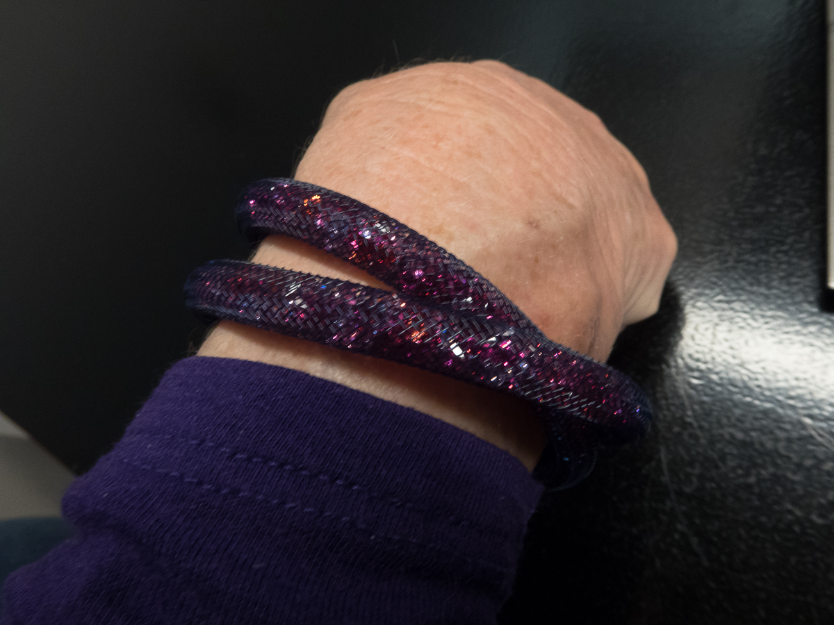 Yesterday was MLW’s birthday, so when we walked past a Swarovski store, the logical choice was to go in and get her a trinket. And so we did, a really cool little bracelet that can double as a necklace made of purple pave crystals on a flexible nylon rope core. If that sounds a bit scientific, well I suppose it is but what’s more important is that it looks really nice.